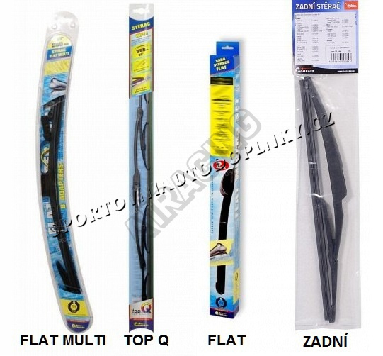 Stěrače FLAT SET (sada 2 ks na celé auto). Vysoce kvalitní pružný člen plochého stěrače zajišťuje stejnoměrný tlak grafitového břitu v celé jeho délce, což zamezuje rozmazávání nečistot a vytváření pruhů.