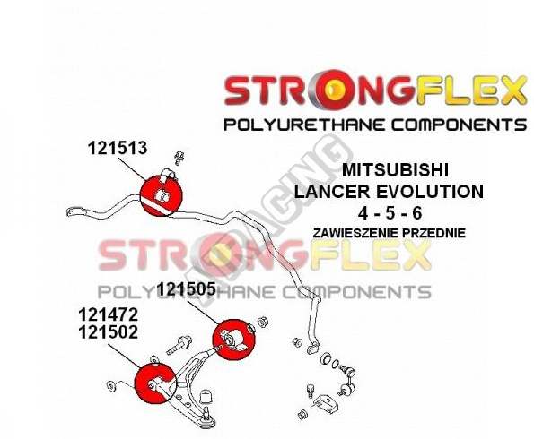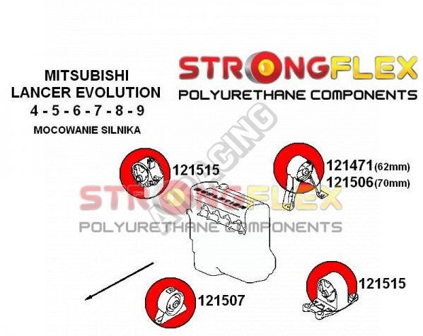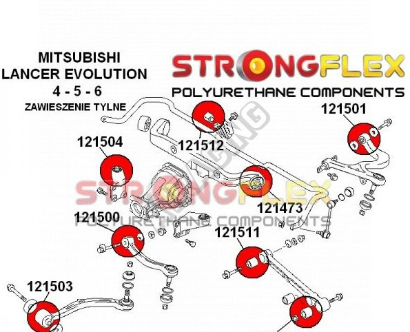 Mitsubishi Lancer Evolution Evo IV-V-VI StrongFlex (tvrdost 80ShA) kompletní sestava silentbloků na celé auto obsahuje :