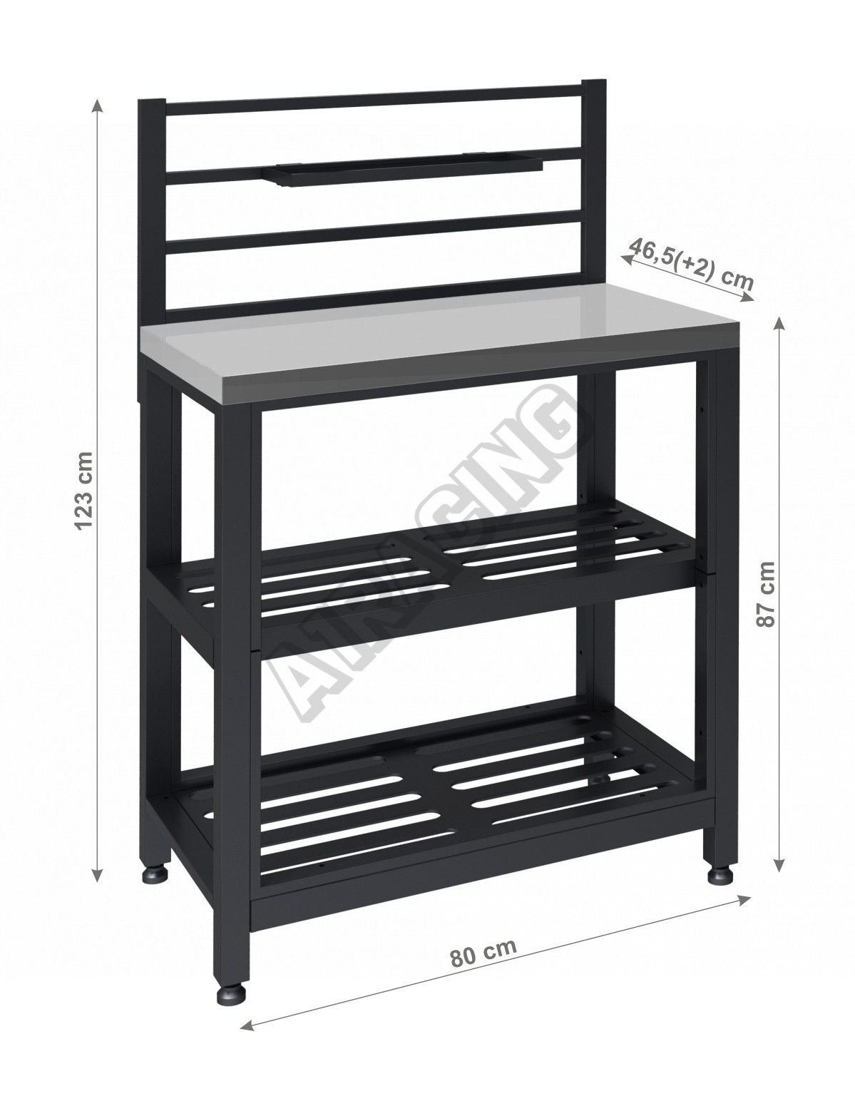 Modul je konstruován z oceli s kvalitní povrchovou úpravou černé barvy. Celkové rozměry 80 x 46,5(+2) x 123 cm. Vrchní, pracovní část, je tvořena z leštěné nerezové oceli a nabízí plochu o rozměrech 80 x 46,5 cm. Pracovní deska je umístěna ve výšce 87 cm.