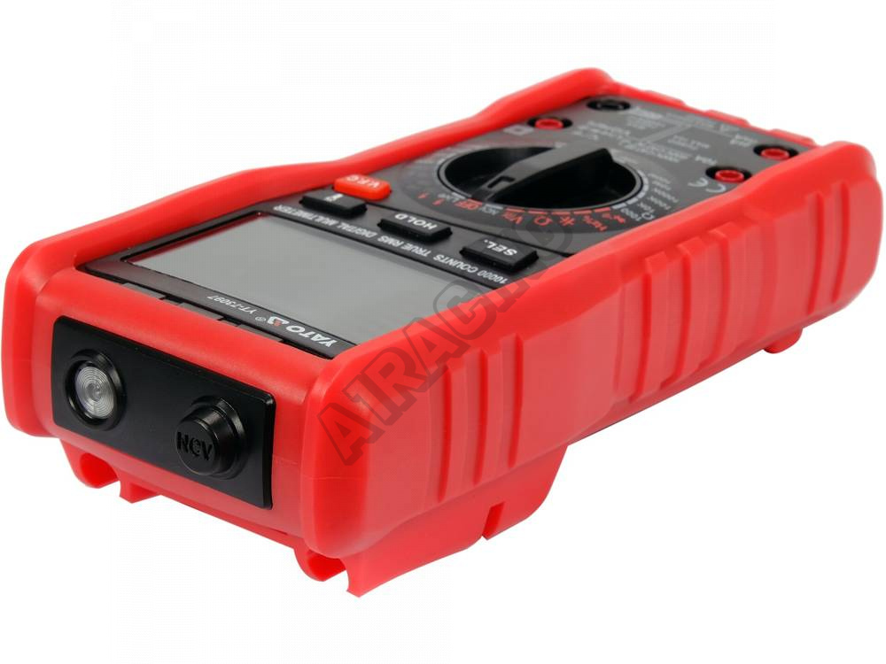 - NCV - bezkontaktní detekce střídavého napětí indukční metodou. Měřič detekuje přítomnost napětí v izolovaném vodiči pomocí senzoru NCV na přední straně zařízení.