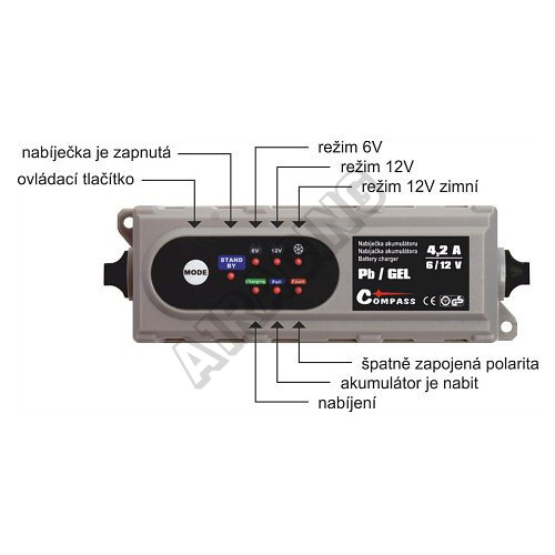 Nabíječka automaticky rozpozná, je-li připojen 6V nebo 12V akumulátor. Při zapojení 12V akumulátoru lze zvolit režim nabíjení standardní nebo zimní.