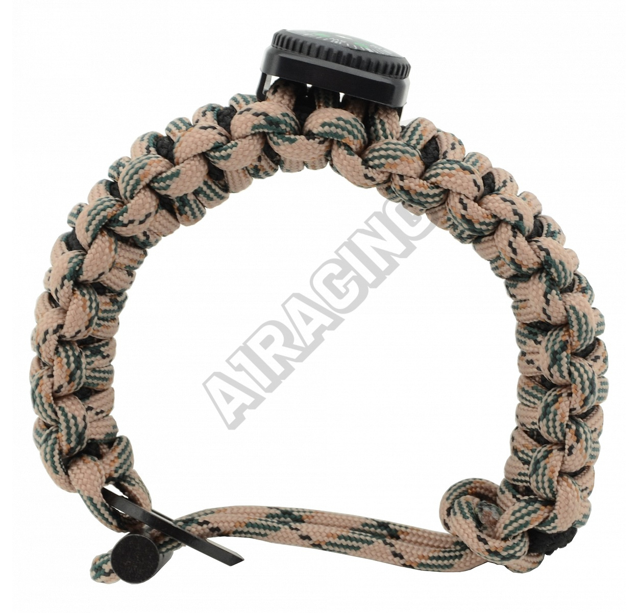 Náramek je pletený z paracordu ve vzoru kobra, který je možné v nouzovém případě kompletně rozplést a použít jako provaz.