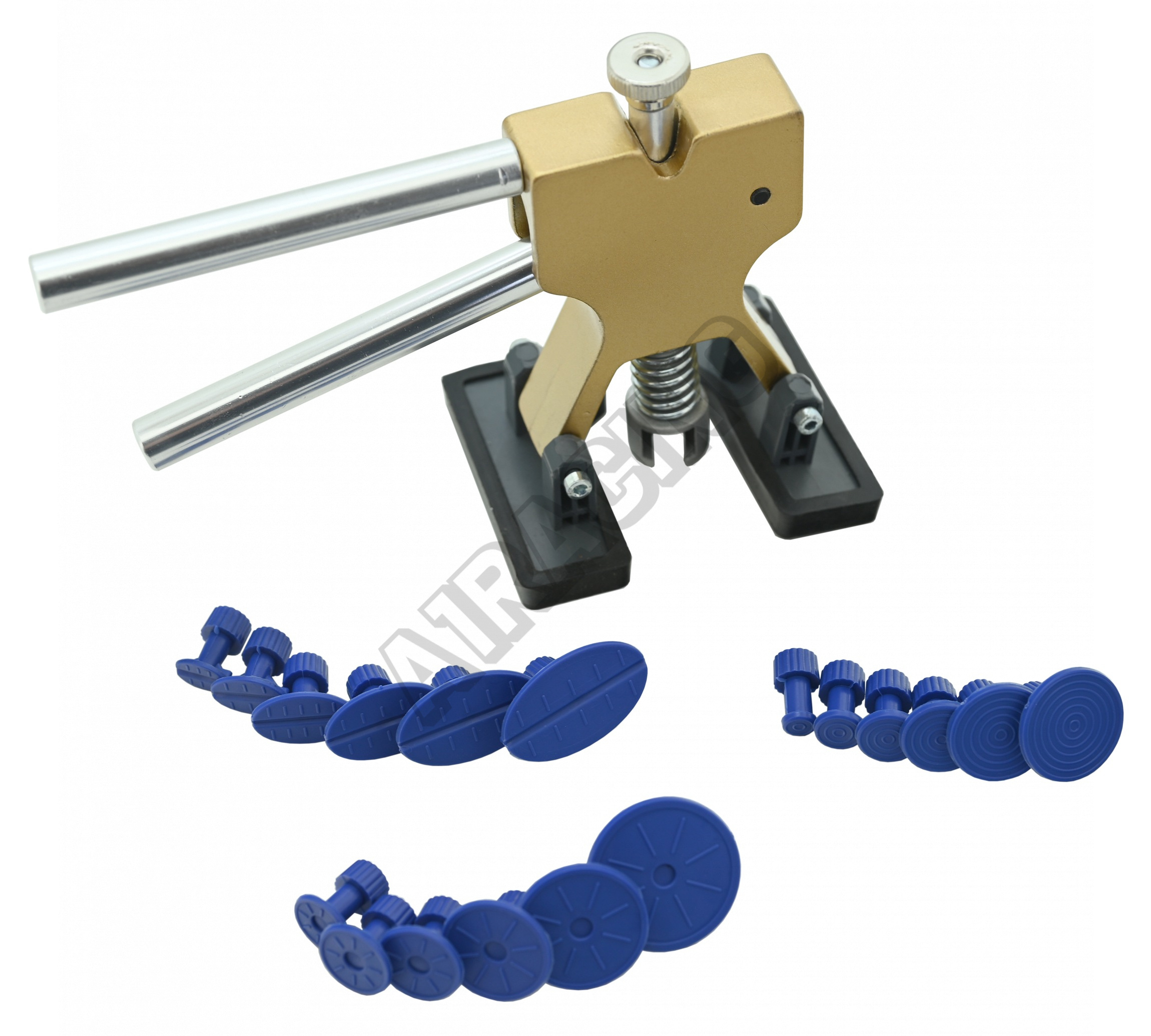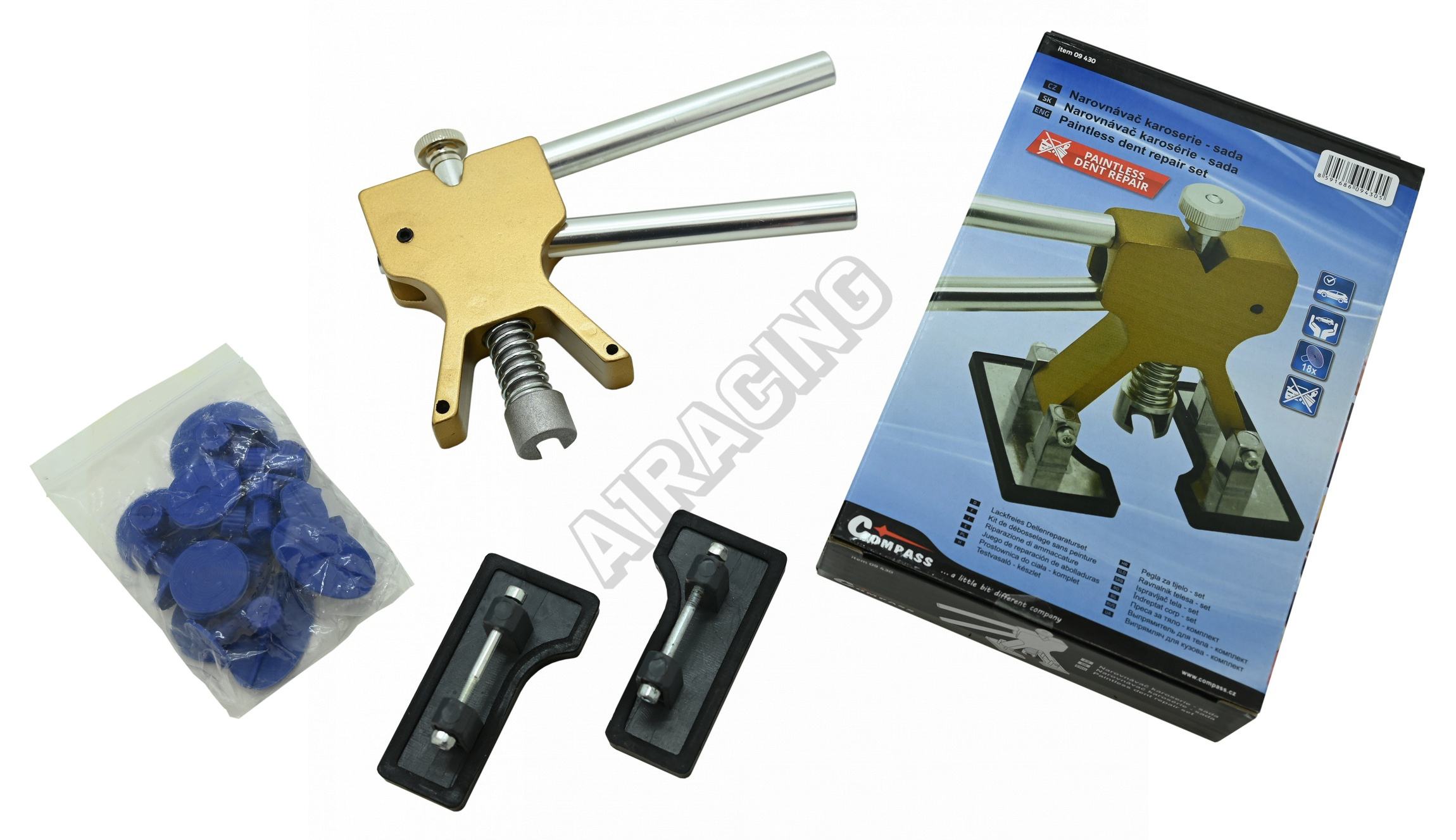 Sada obsahuje několik kusů plastových vytahovacích trnů různých rozměrů a tvarů. Trny jsou na karoserii umístěny aplikací lepidla z běžné tavné pistole (není přiložena).