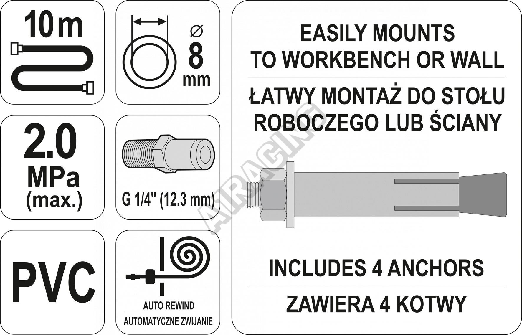 Profesionální naviják se vzduchovou hadicí s délkou 10 m. Naviják lze upevnit přímo na zeď. Hadice j