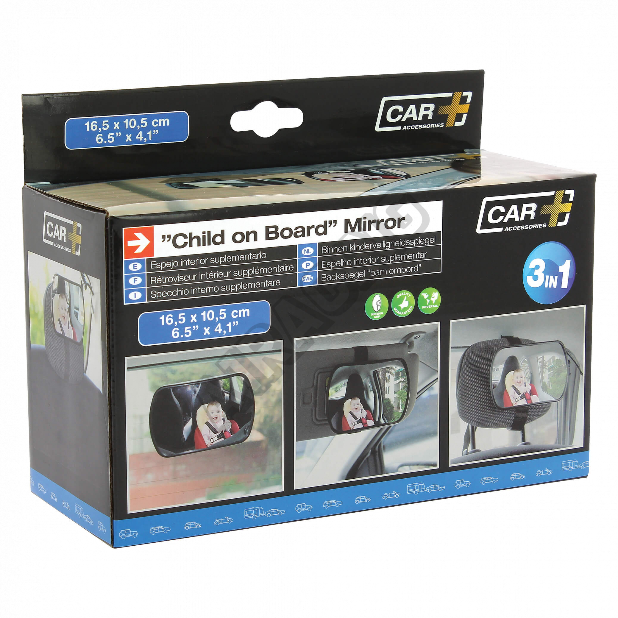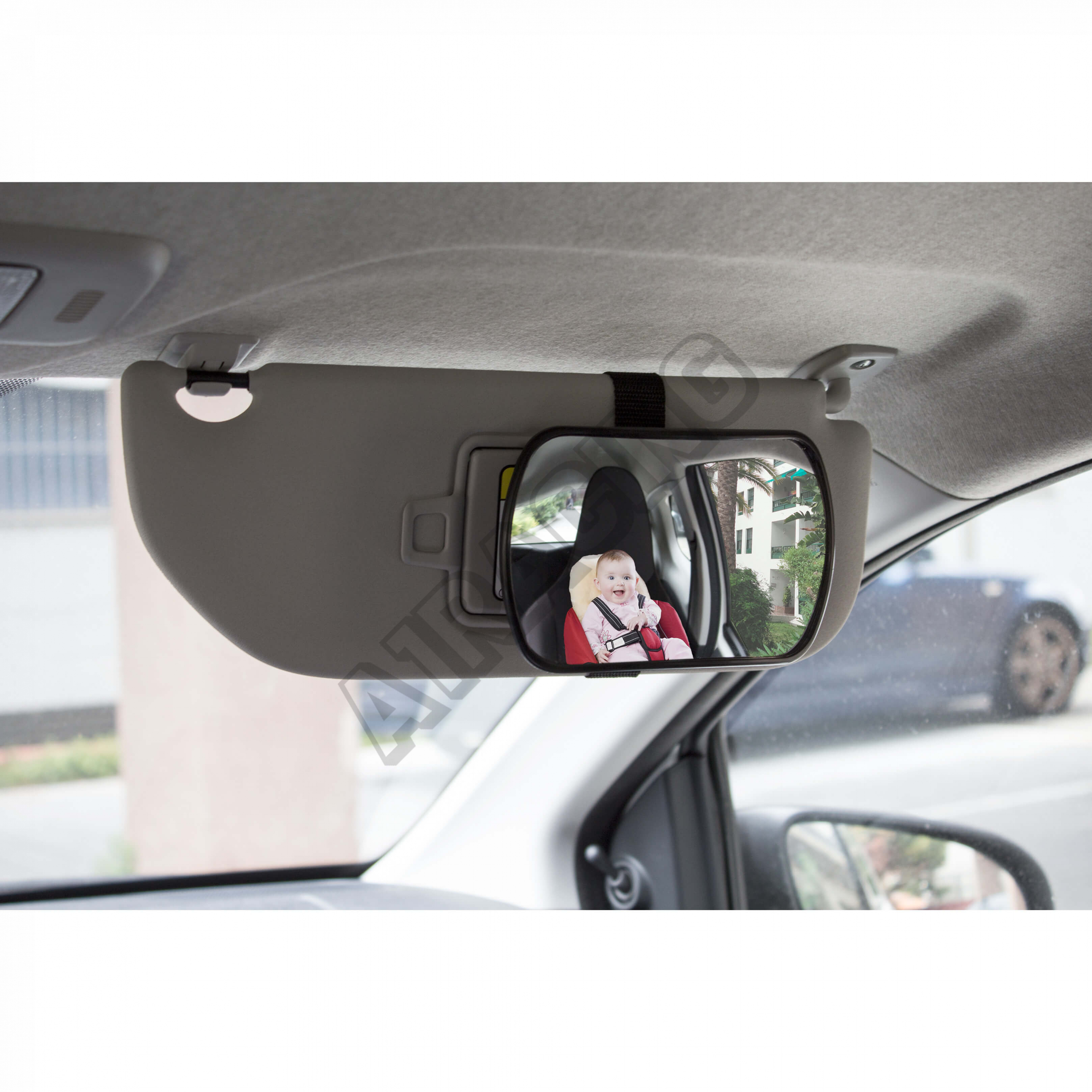 Použít lze na přední sklo, za slunční clonu a třeba za opěrku hlavy, kde kromě uchycení na přísavku je součástí balení také kloubový popruh. Díky velikosti 165x105 mm a také prohnutí celého zrcátka, které tak zabere vetší plochu, kterou chcete mít stále na očích, vám už nic neunikne co se děje za váma.