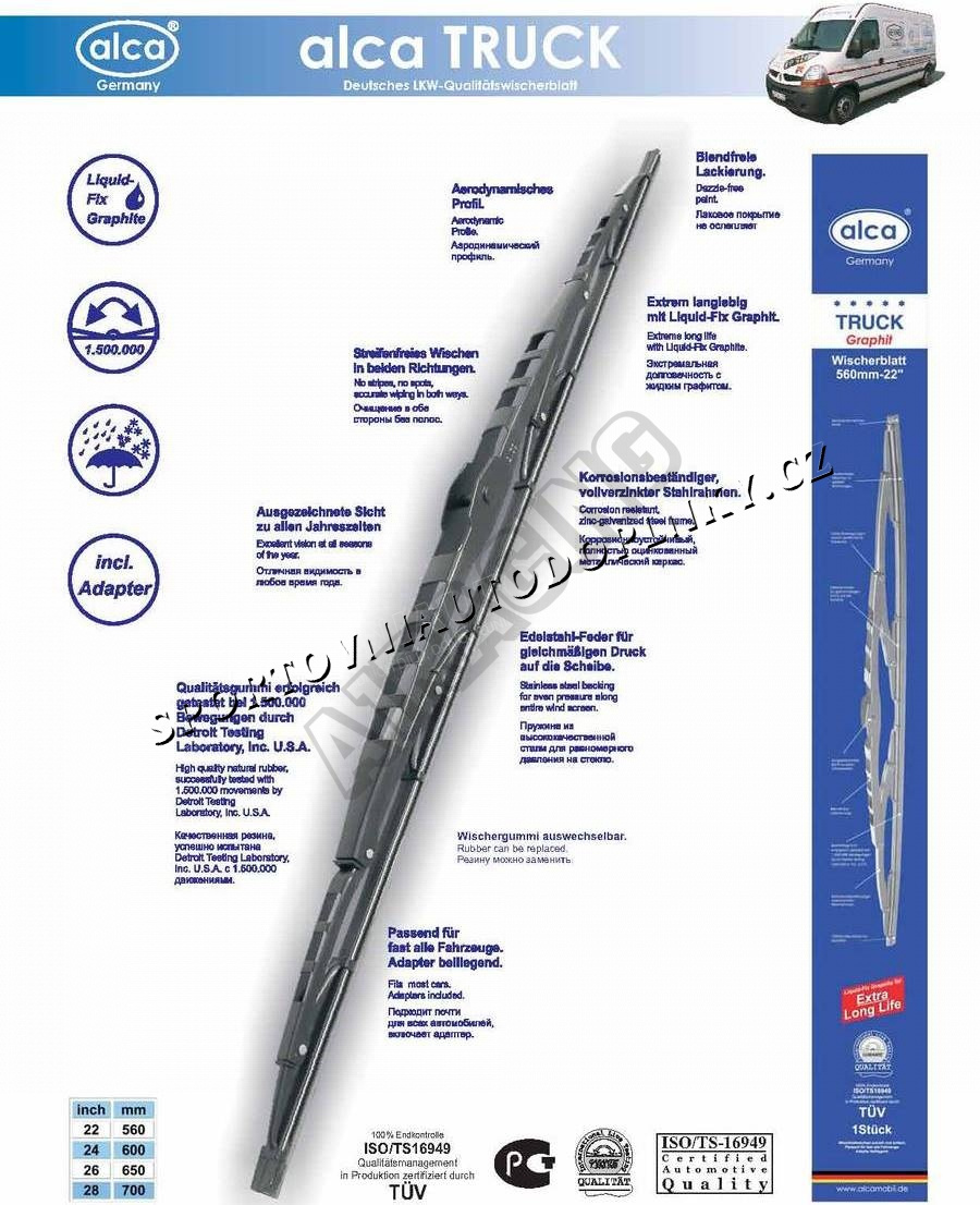 pozor širší střed stěrače, jen pro auta s šiším ramenemNěmecké kvalitní kovové stěrače ALCA TRUCK s grafit. břitem (uchycení na hák)