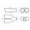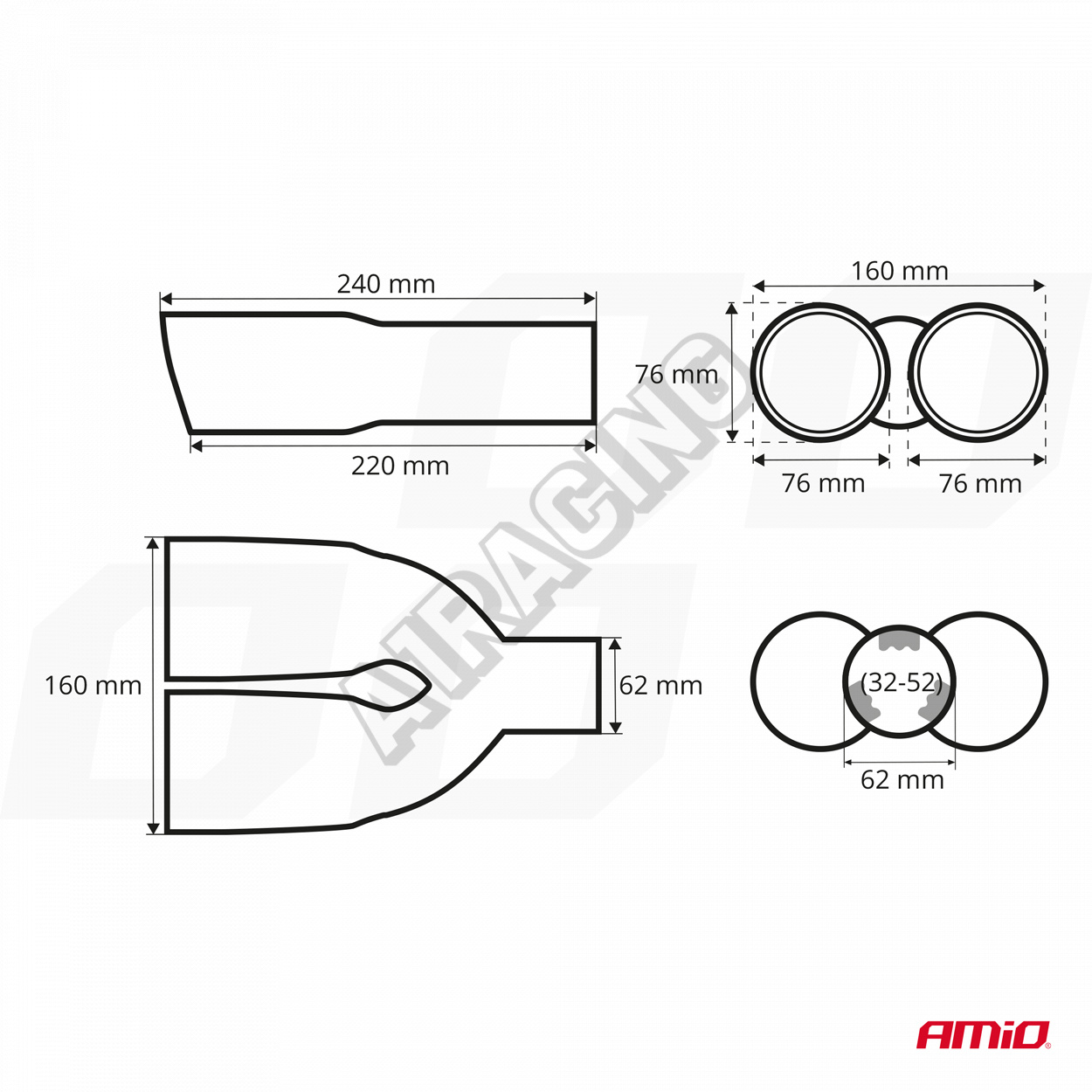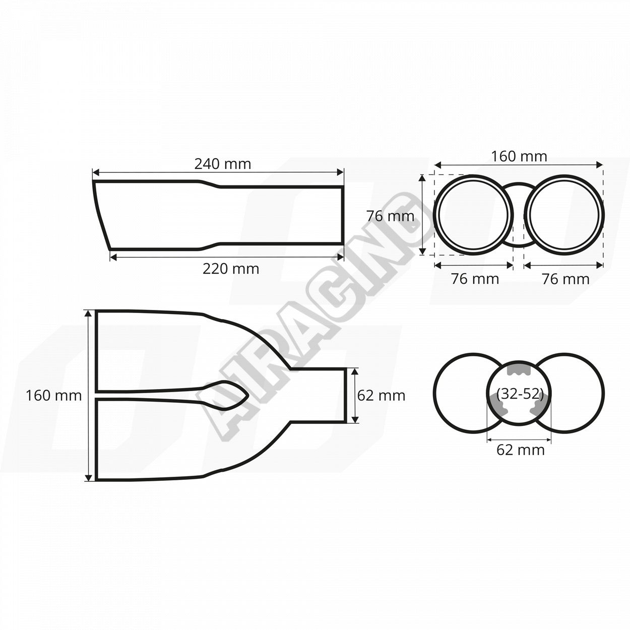 Rozměry výfukové koncovky: délka 240 mm, průměr koncovky 2 x 76 mm, šířka 160 mm, průměr pro nasazení 32-52 mm, pro navaření až 62 mm. Uvnitř koncovky je ještě designová mřížka, která bude vidět ze zadního pohledu auta.