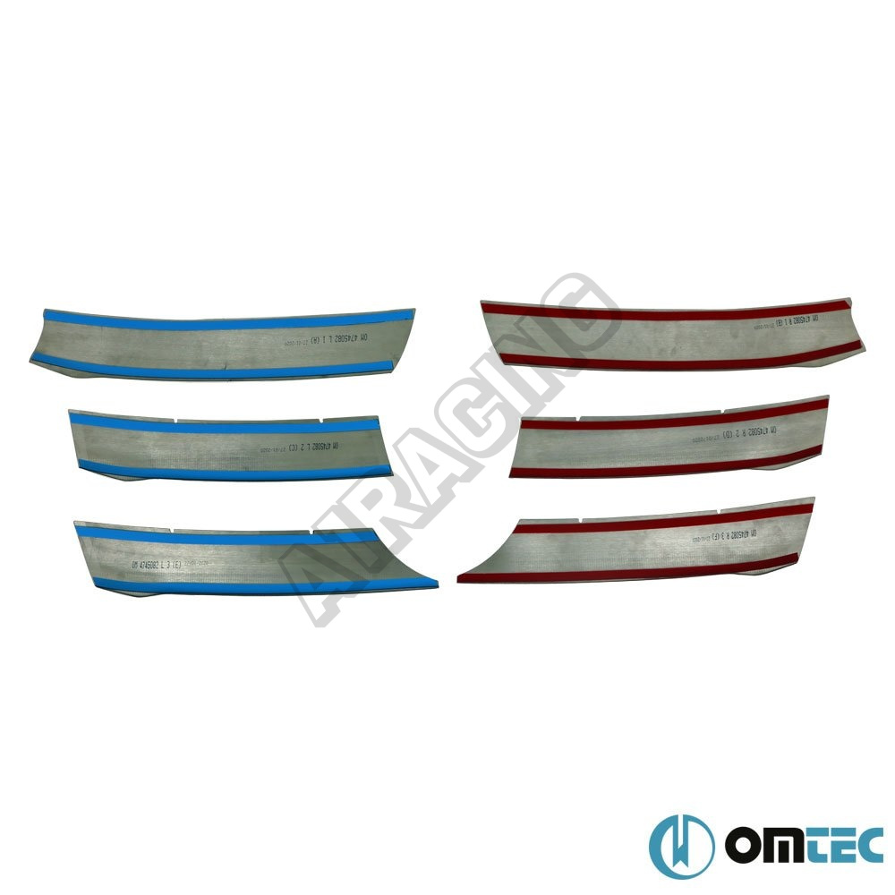Pozor : Každý tento díl se musí lepit aspoň při teplotě 10 °C, kde před instalací musí být lepená část naprosto čistá a suchá, aby vnitřní polep se perfektně uchytil. Pokud chcete maximalizovat uchycení. Můžete na několika místech bodově přidat 2-složkové lepidlo. Výsledkem bude pevné spojení, které už nepovolí - ale není to podmínkou, dobře očištěný a nalepený díl jen na oboustranné pásky jde velmi těžko sundat. Proto je dobré hned na poprvé daný díl dobře přesně nasadit.