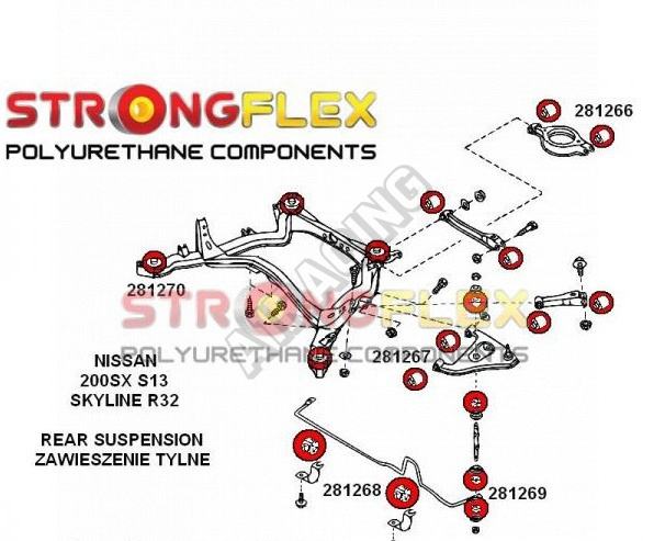 Nissan 200SX S13 1988-93 StrongFlex sestava silentbloků pro přední a zadní nápravu 33 ks obsahuje: