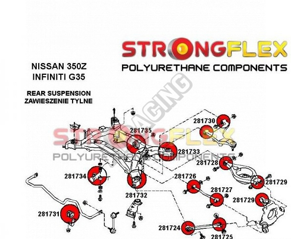 Nissan 350Z StrongFlex (tvrdost 80ShA) kompletní sestava silentbloků na celé auto obsahuje :