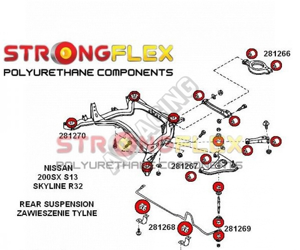 Nissan Skyline R32 StrongFlex (tvrdost 80ShA) kompletní sestava silentbloků na celé auto obsahuje :