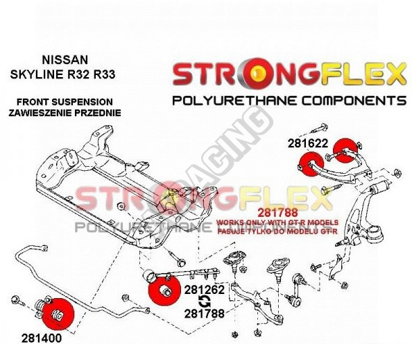 Nissan Skyline R34 StrongFlex (tvrdost 80ShA) kompletní sestava silentbloků na celé auto obsahuje :