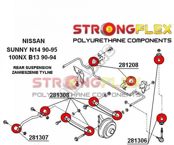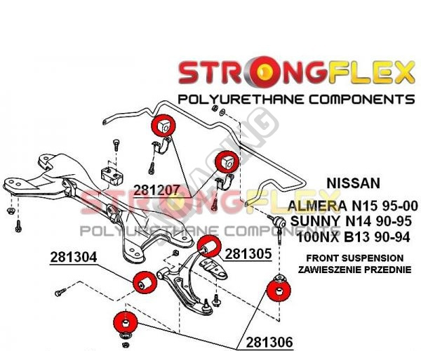 Nissan Sunny StrongFlex Sport (tvrdost 90ShA) kompletní sestava silentbloků na celé auto obsahuje :