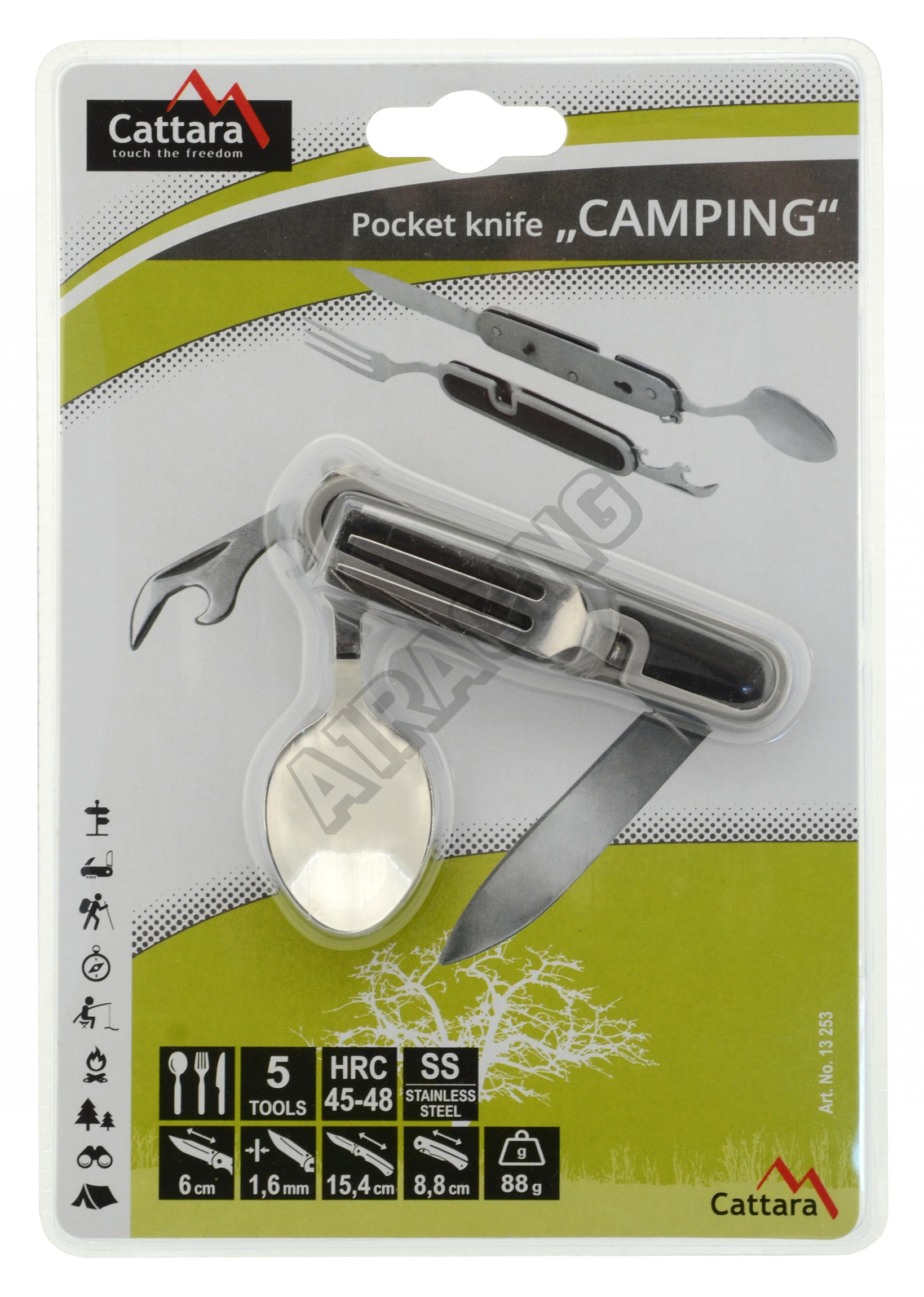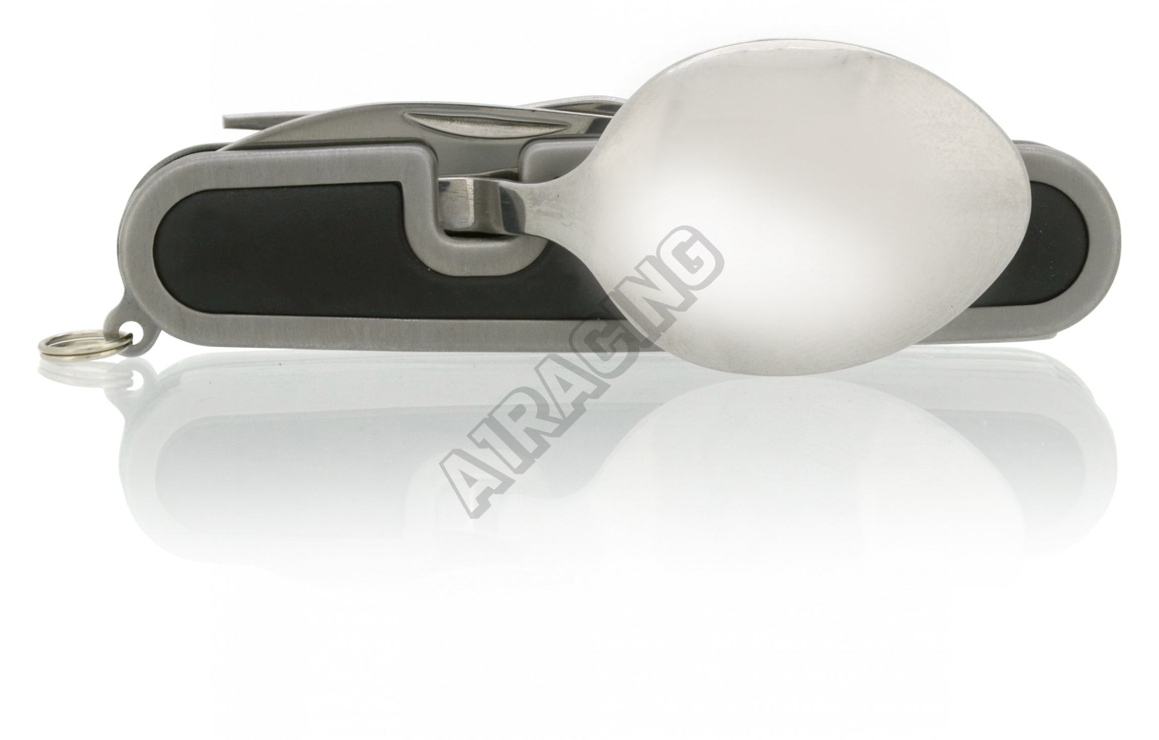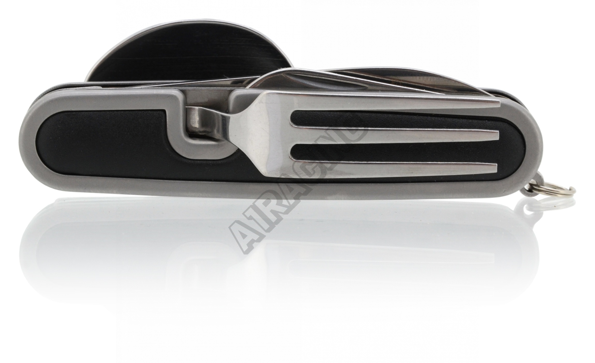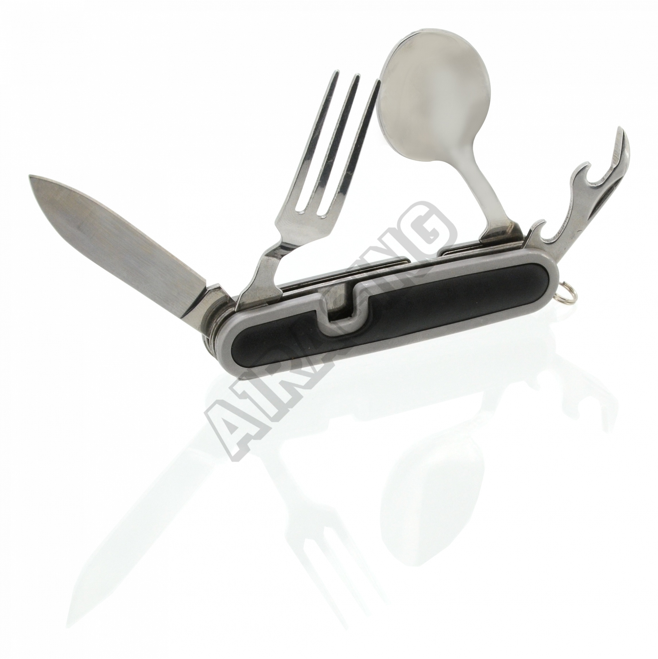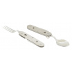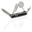 První část nože se skládá z vidličky, otvíráku na plechovky a víčka lahví, druhá část skrývá lžíci a samotnou čepel nože.