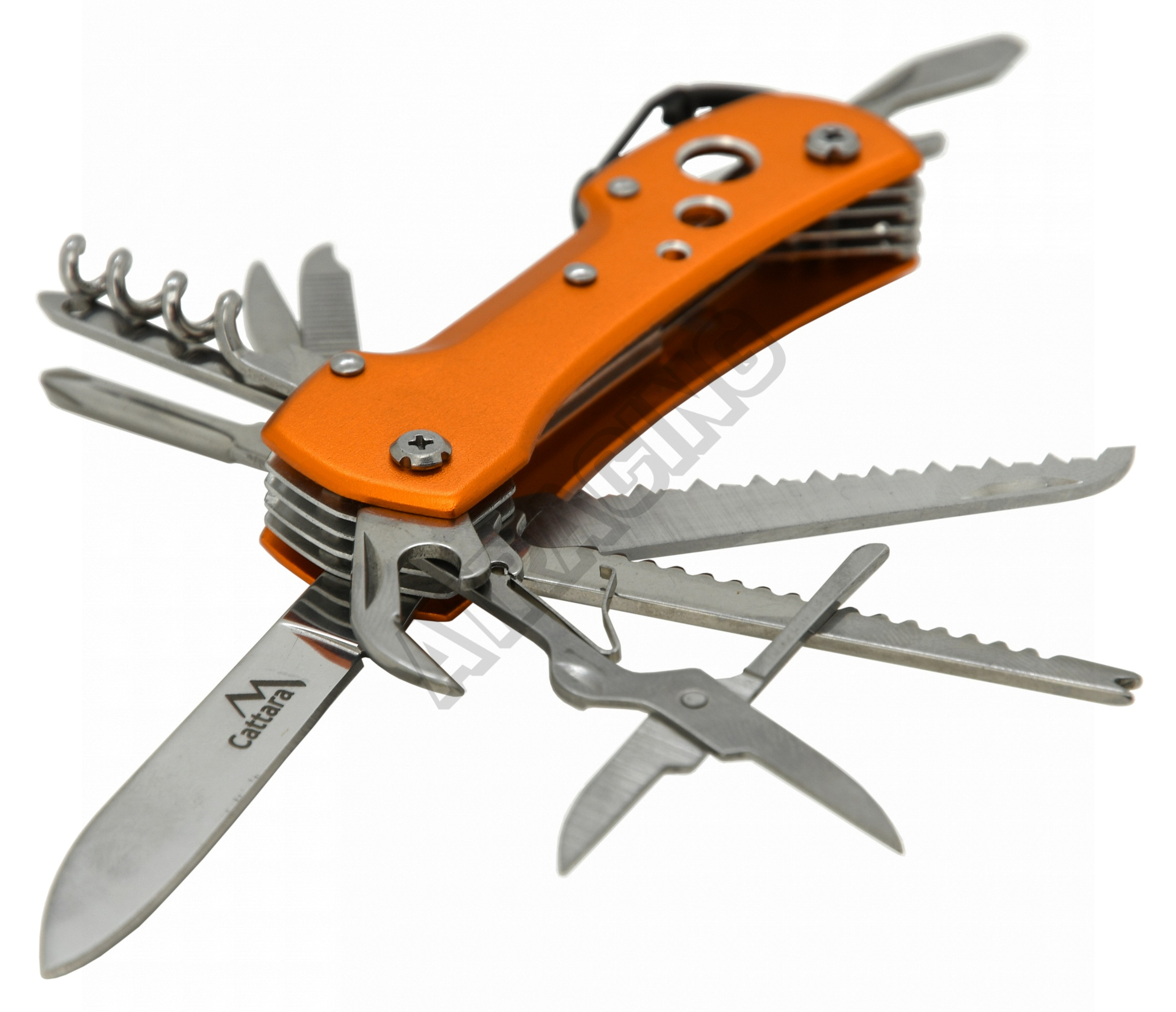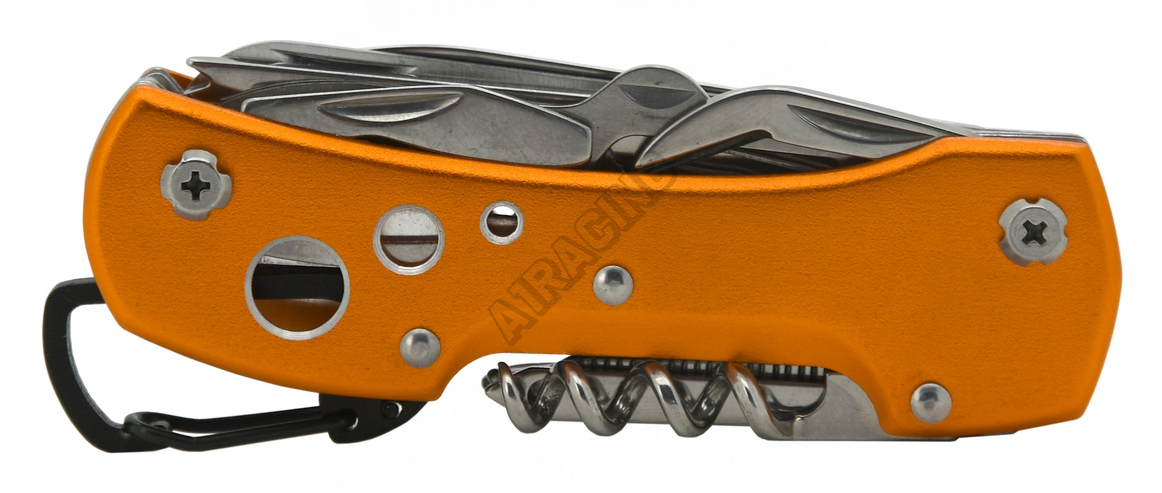 Na vnitřní straně, tedy vespod rukojeti, se skrývají otvírák na plechovky, nůžtičky, škrabák na rybí šupiny, pilka na dřevo a samotný nůž délky 6 cm. Na druhé, vnější straně rukojeti se ukrývají křížový šroubovák nejběžnějších rozměrů, šídlo, pilníček, oko na hrubé šití a vývrtka na korkové špunty. Na zadní straně je rukojeť opatřena očkem pro přichycení např. na klíče a v neposlední řadě otvírákem na zátky, který může být použit i jako plochý šroubovák.