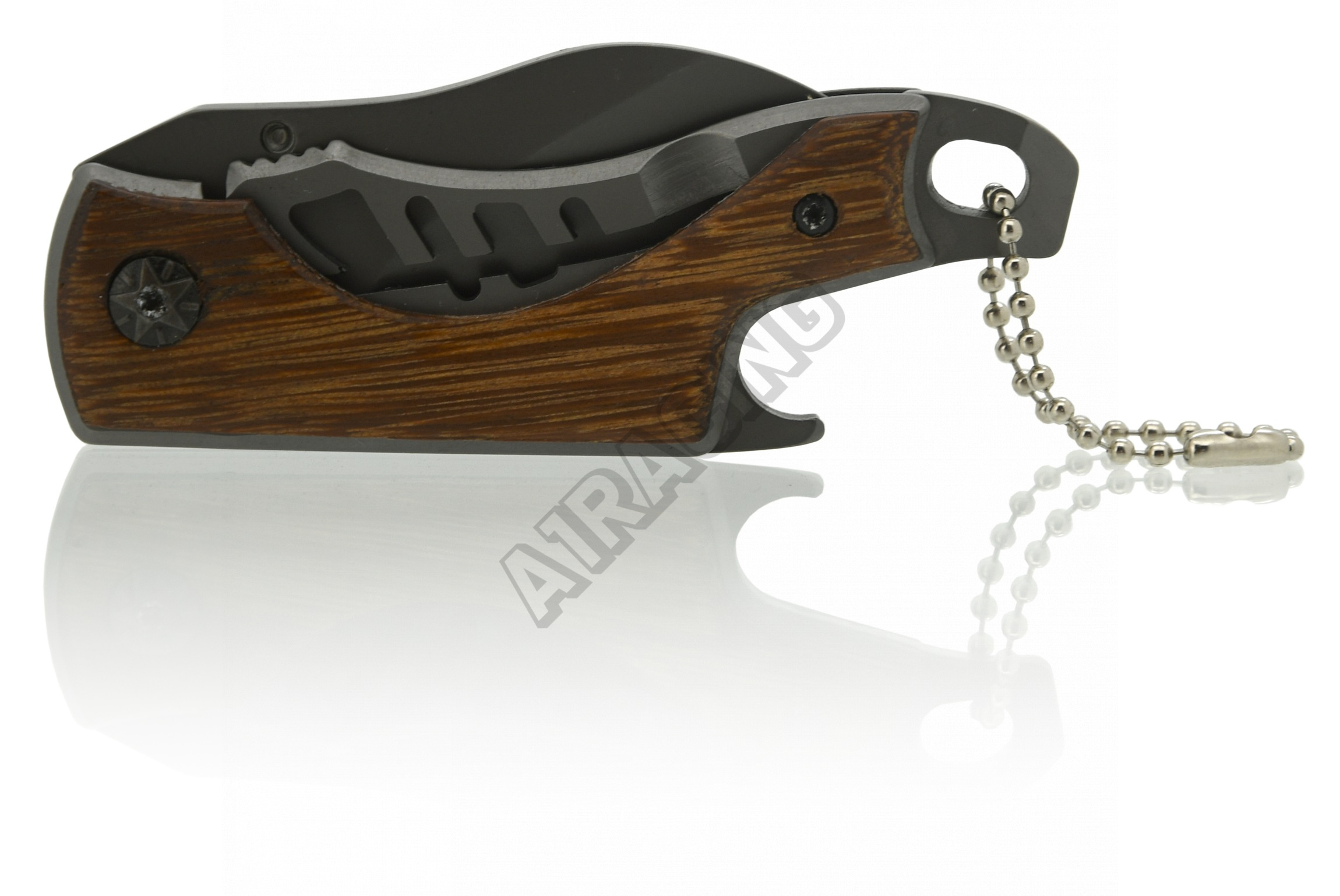 Střenky rukojeti dokonale imitují dřevo a spolu s atraktivní perforací těla tvoří líbivý, drobný nožík, který padne do kterékoliv kapsy. Zadní strana nože je doplněna o otvírák lahví a klínek například pro rozbití ořechu.