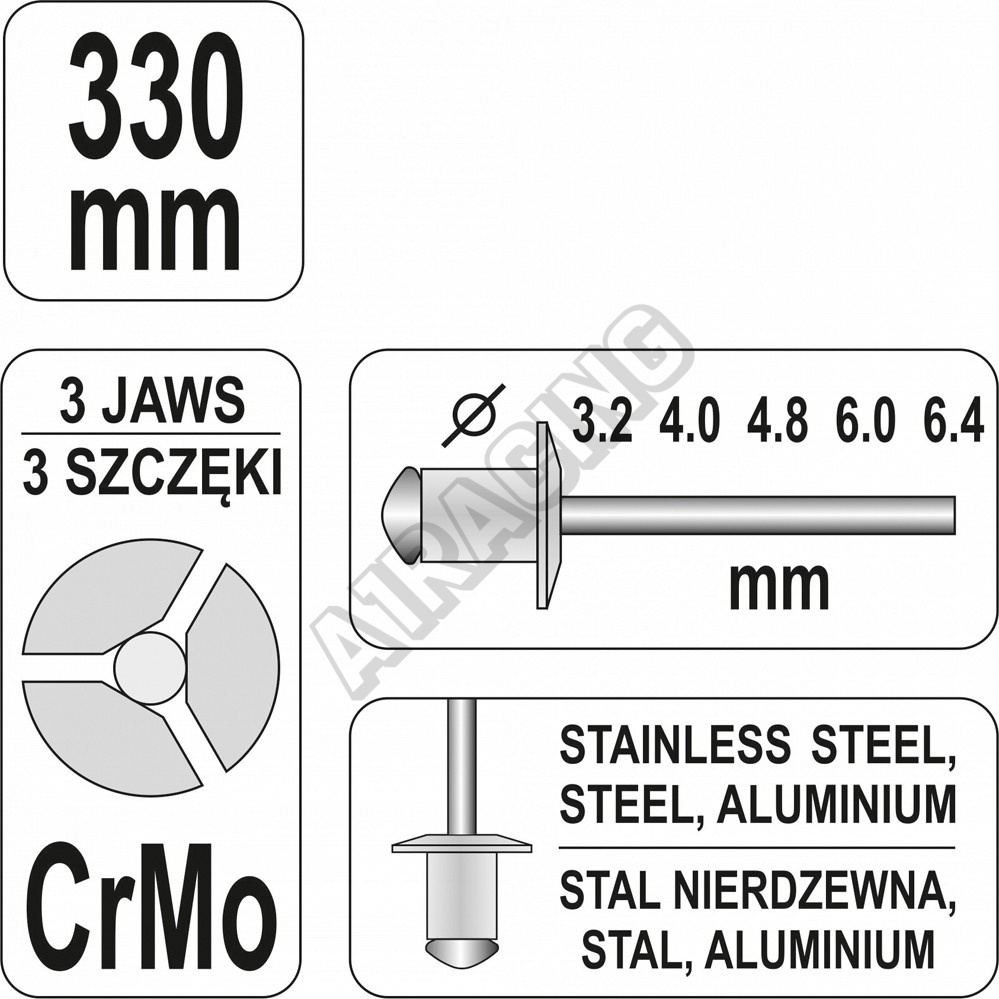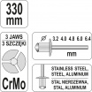 Klešte mají délku 330 mm, čelisti jsou precizně zpracovány z CrMo oceli a jsou určené pro nýty 3,2 - 6,4 mm.