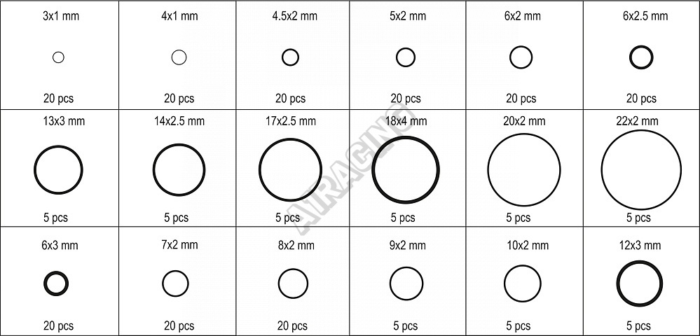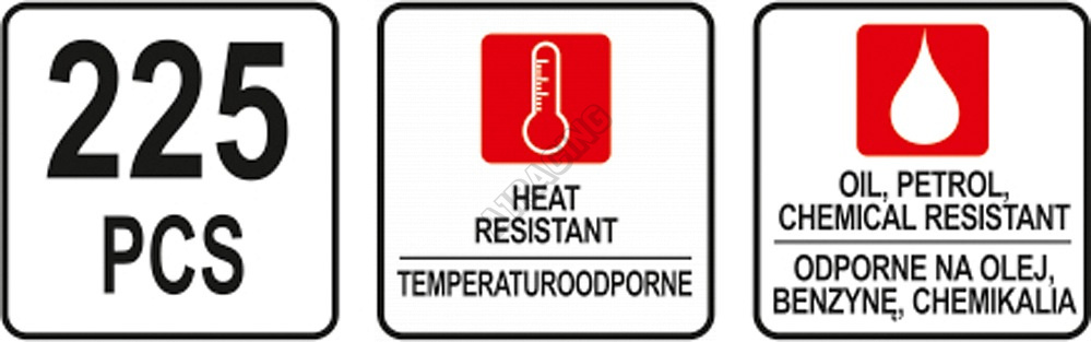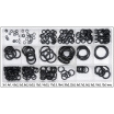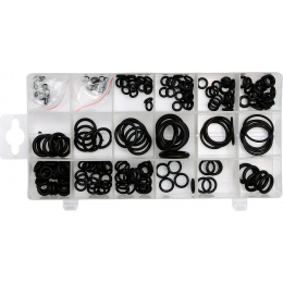 Sada 225 ks o-kroužků vyrobených z odolné gumy, odolávající oleji, palivu, chemikáliím a vysokým teplotám.