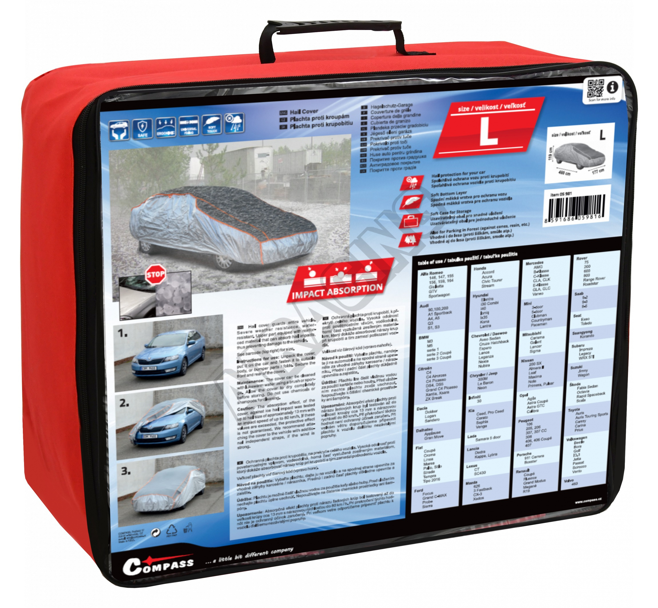 Ochranná plachta proti krupobití, k překrytí celého vozidla. Vysoká odolnost proti povětrnostním vlivům, voděodolná. Horní část vyztužená zesíleným materiálem, který dokáže absorbovat nárazy krup při krupobití a tím zamezí poškození vozidla.