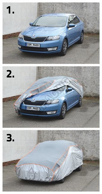Jednoduché upevnění plachty - pouze se nasadí na automobil, na spodku se upevní část s všitou gumou za vhodné záhyby karoserie / nárazníku a přední i zadní část plachty se důkladně upevní pomocí všitých popruhů se sponami.