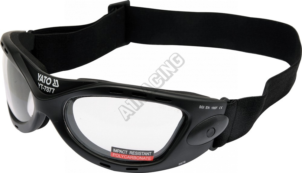Ochranné brýle z polykarbonátu, s bočním odvětráváním a s nastavitelným nylonovým páskem.
