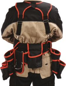 Opasek na nářadí s popruhy a dvěma velkými univerzálními kapsami, kovovým držákem na kladivo a jednou hlubokou kapsou na hřebíky nebo šrouby. Pro uložení a přepravu nářadí používaného při práci.