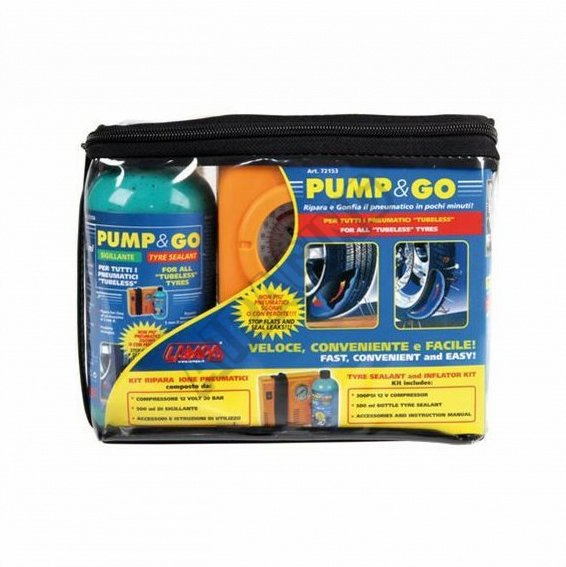 Opravná sada defektu PUMP & GO s kompresorem 12V Lampa Italy. Obsah gel 500ml, kompresor 12V, 20bar, 300psi. Napájení do autozásuvky 12V. Určeno pro všechny pneumatiky. Určeno pro běžné defekty, ne pro boční trhliny.
