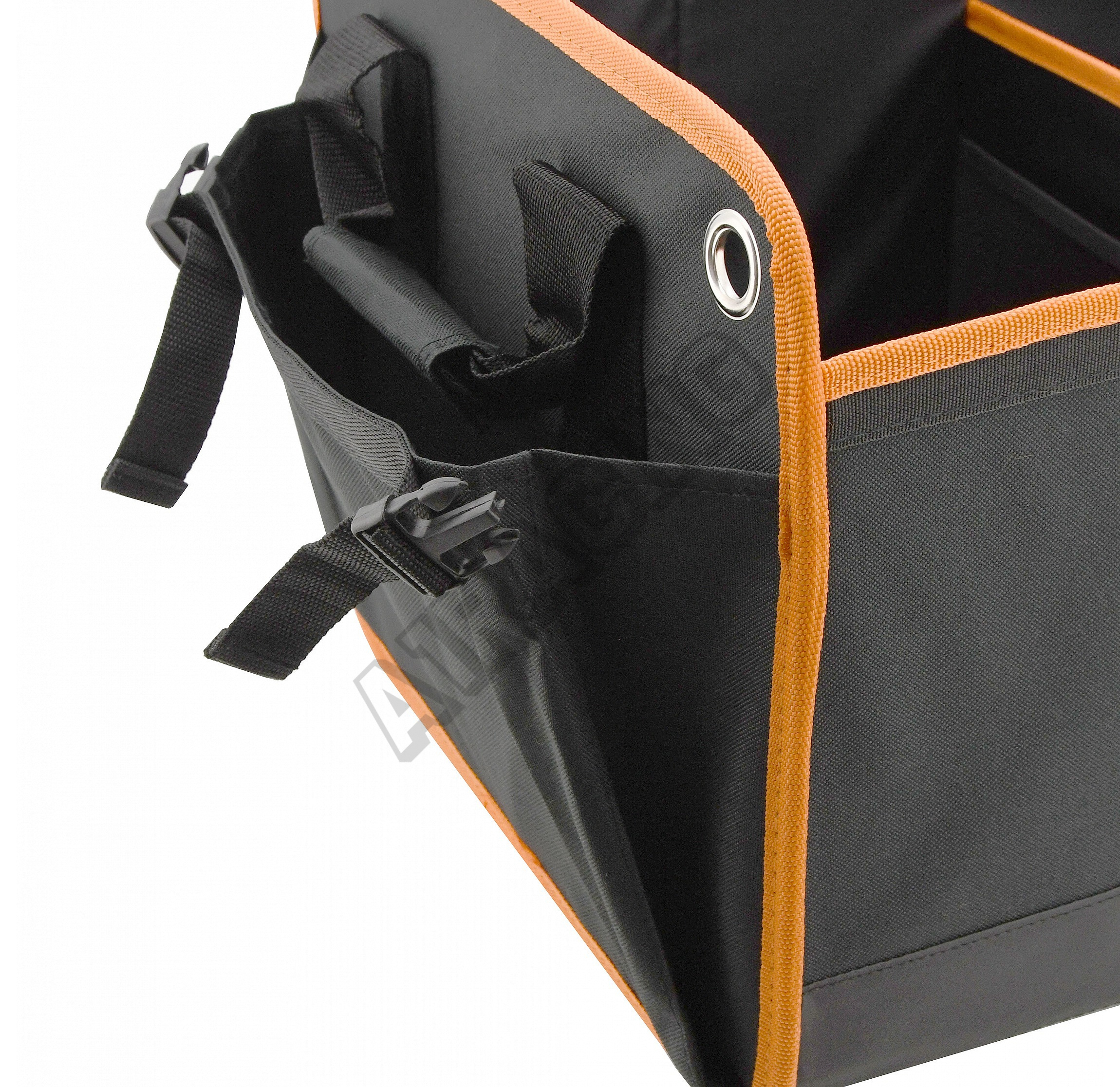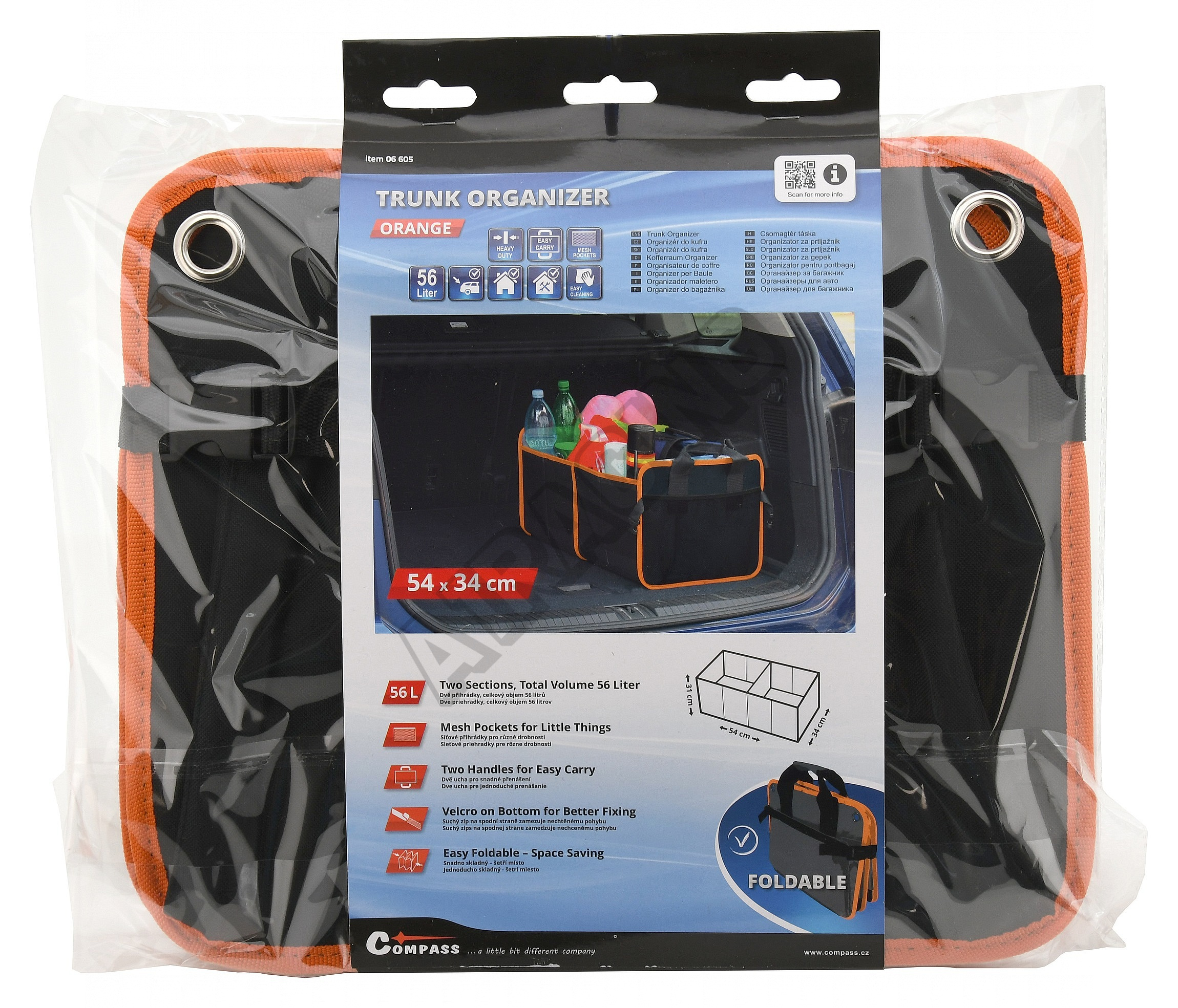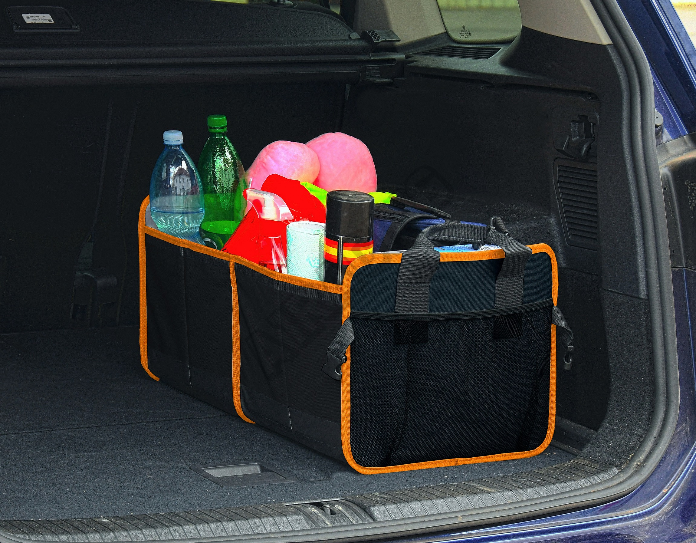 Organizér s rozměry 54 x 34 x 31 cm je zhotoven ze 100% polyesteru, kvalitně obšitého oranžovým lemem.