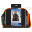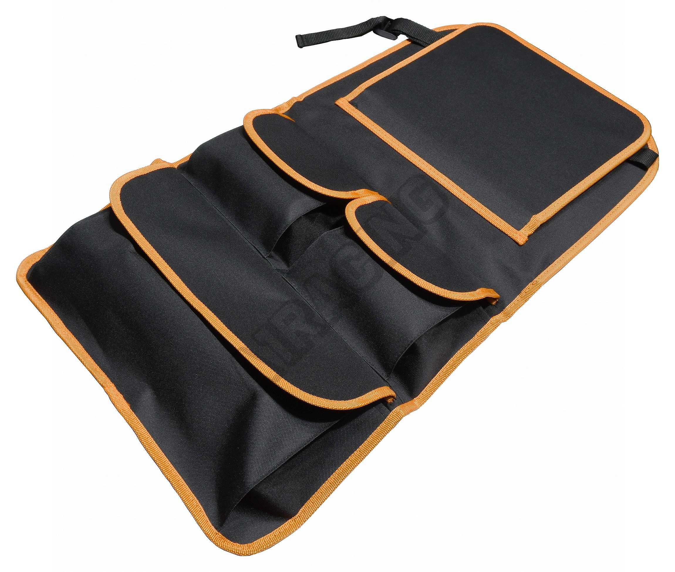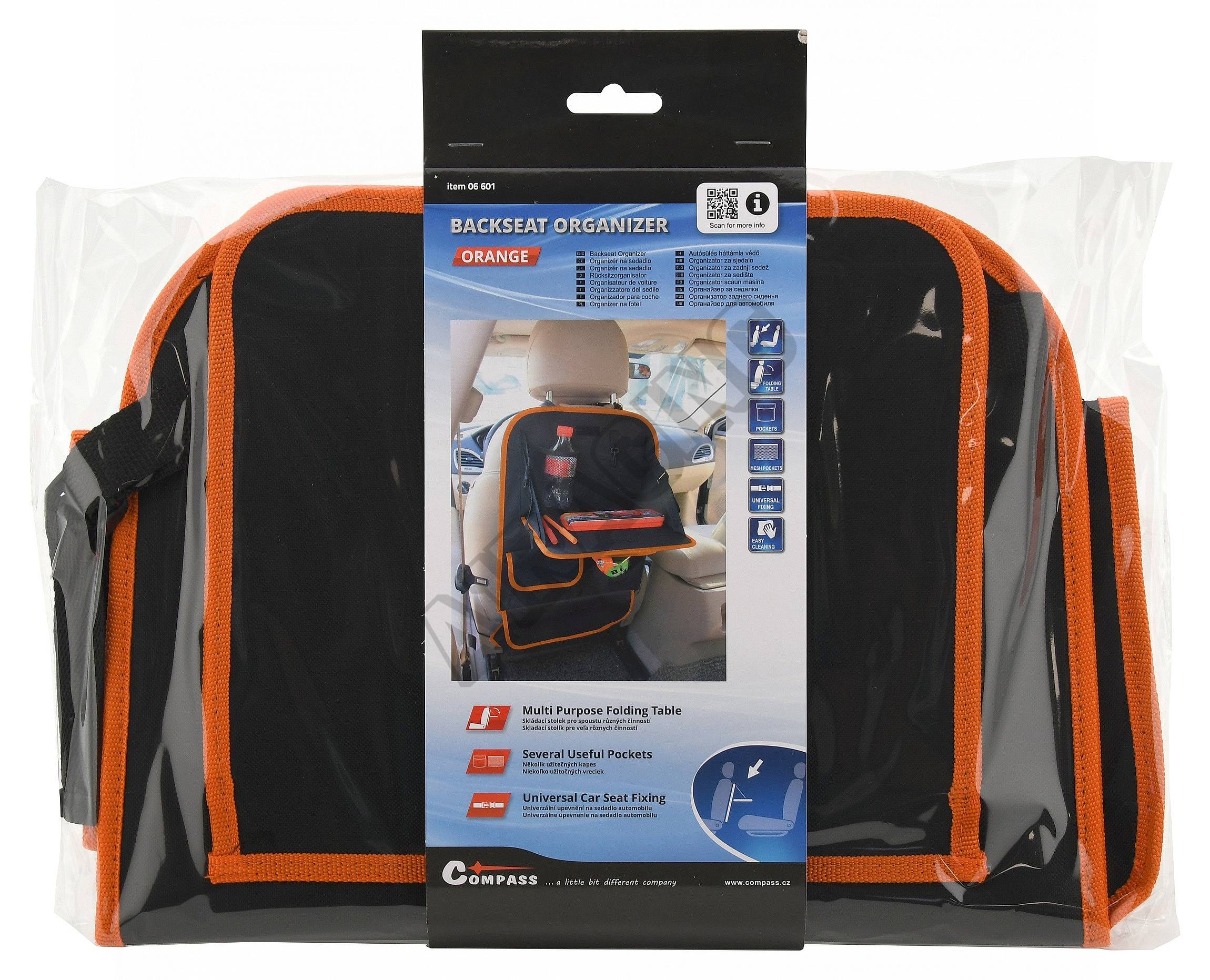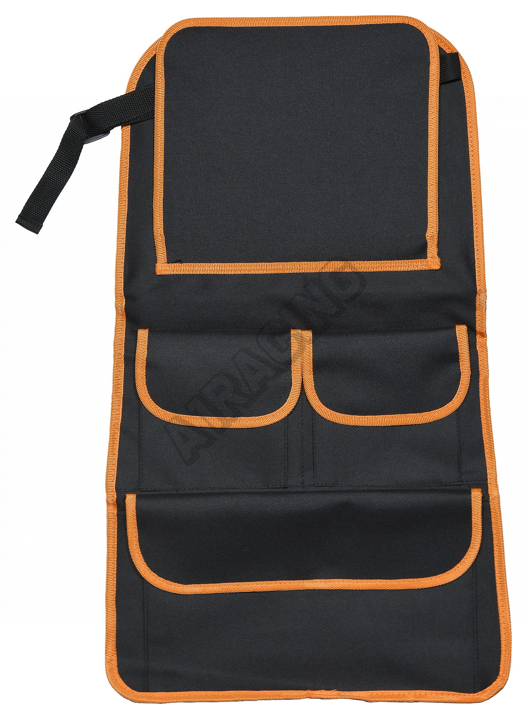Organizér s rozměry 40,5 x 69,5 cm chrání sedadlo před znečištěním a je zhotoven ze 100% polyesteru, kvalitně obšitého oranžovým lemem. Snadno a rychle se uchycuje na zadní stranu přední sedačky automobilu pomocí nastavitelného popruhu s klipem a pomocí provázků.
