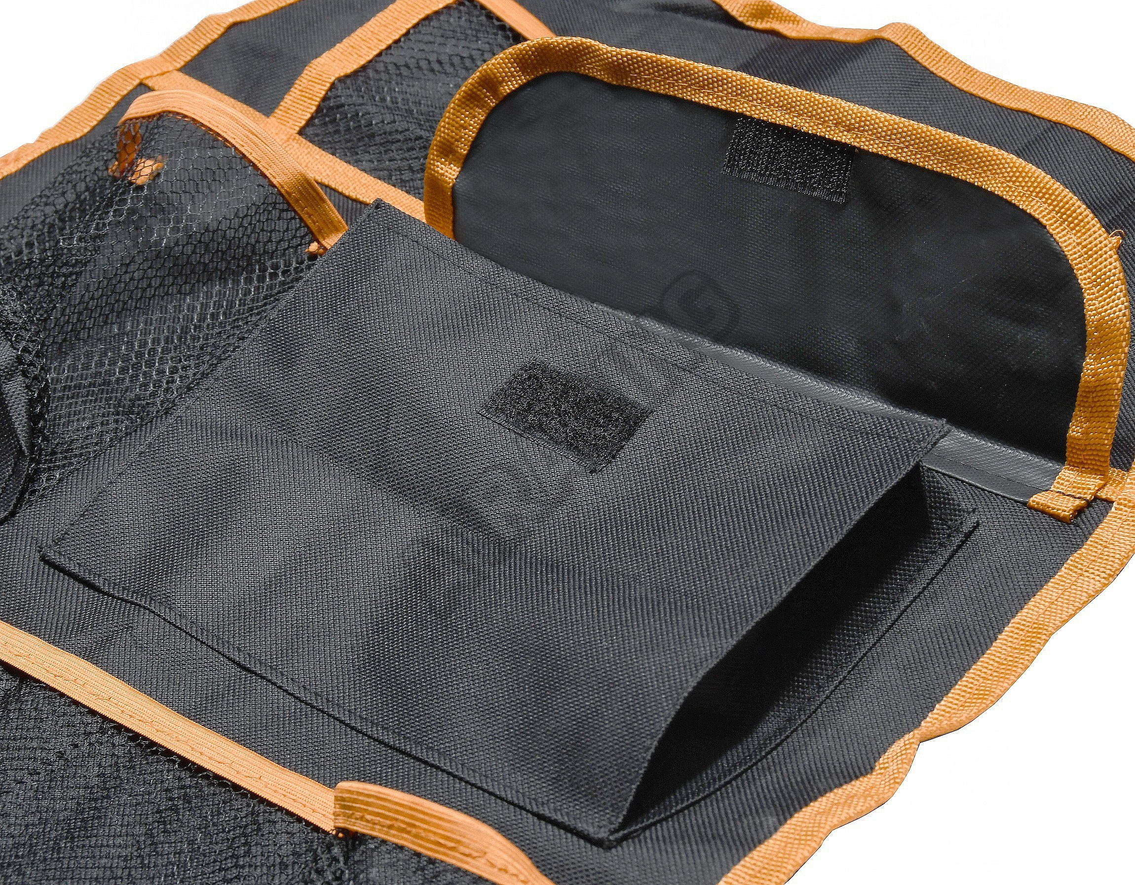 Disponuje kapsami, sítěnými přihrádkami, držáky na lahve a uzavíratelnou kapsou na suchý zip. Organizér je zhotoven ze 100% polyesteru, kvalitně obšitého oranžovým lemem. Kapsy jsou opatřeny gumou oranžové barvy.