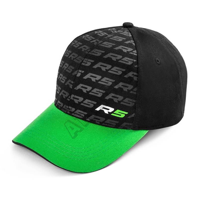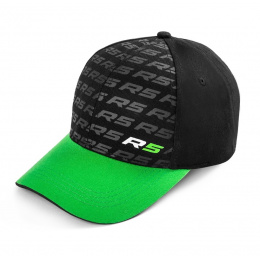 Černá kšiltovka Motorsport se zeleným kšiltem, střih se 6 panely, zelený pásek k regulaci velikosti s kovovou přezkou s vystouplým logem ŠKODA. Branding: potisk R5 na celých dvou předních panelech, bílé ŠKODA. Motorsport na boku.