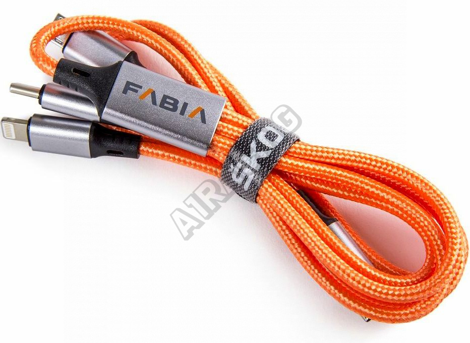 Nabíjecí USB kabel 3v1 s brandingem FABIA. Konektory USB-C a trojkombinace micro USB, USB-C, Lightning. Délka 80 cm.