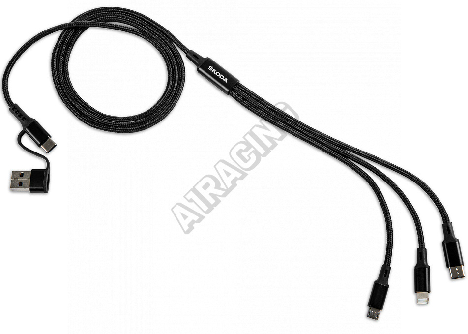 Nabíjecí USB kabel 4 v 1 s brandingem ŠKODA. USB konektor - C včetně adaptéru na USB A (rychlost nabíjení 2,4 A) trojkombinace micro USB + USB - C + Lightning. Nejedná se o datový kabel.