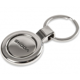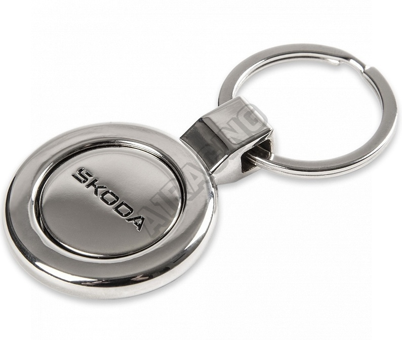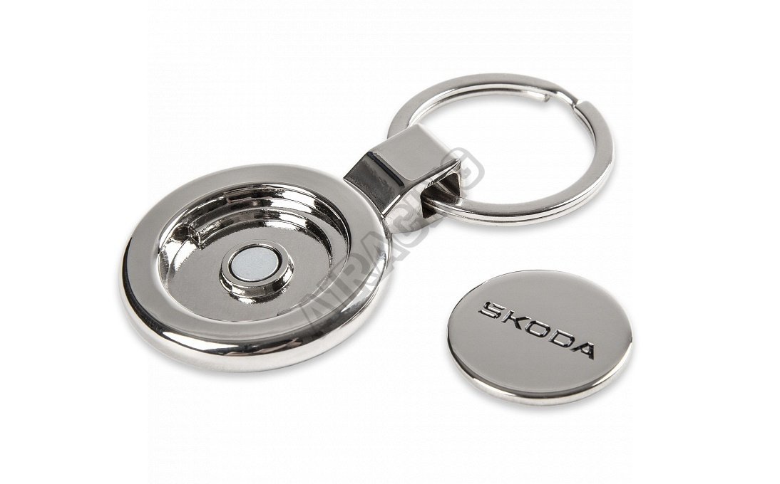 Kovová klíčenka s logem ŠKODA s odnímatelným žetonem na zadní straně. Velikost žetonu odpovídá minci v hodnotě 10 CZK.