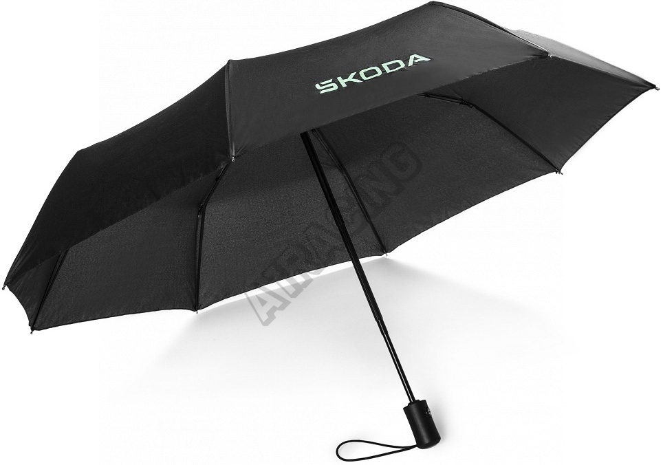 Černý skládací deštník s 8 panely, na jednom panelu aquaprint Škoda (viditelné po navlhčení materiálu), na dalším panelu electric green potisk Škoda o délce 14 cm.