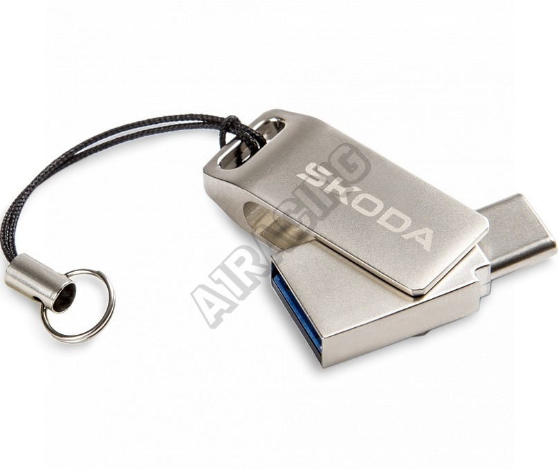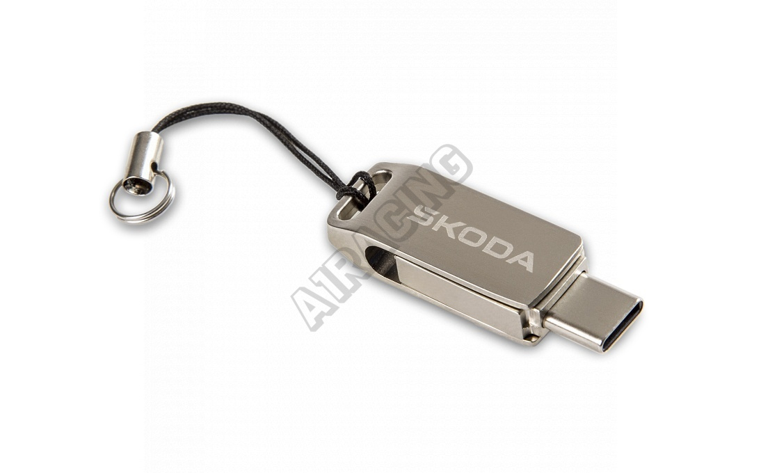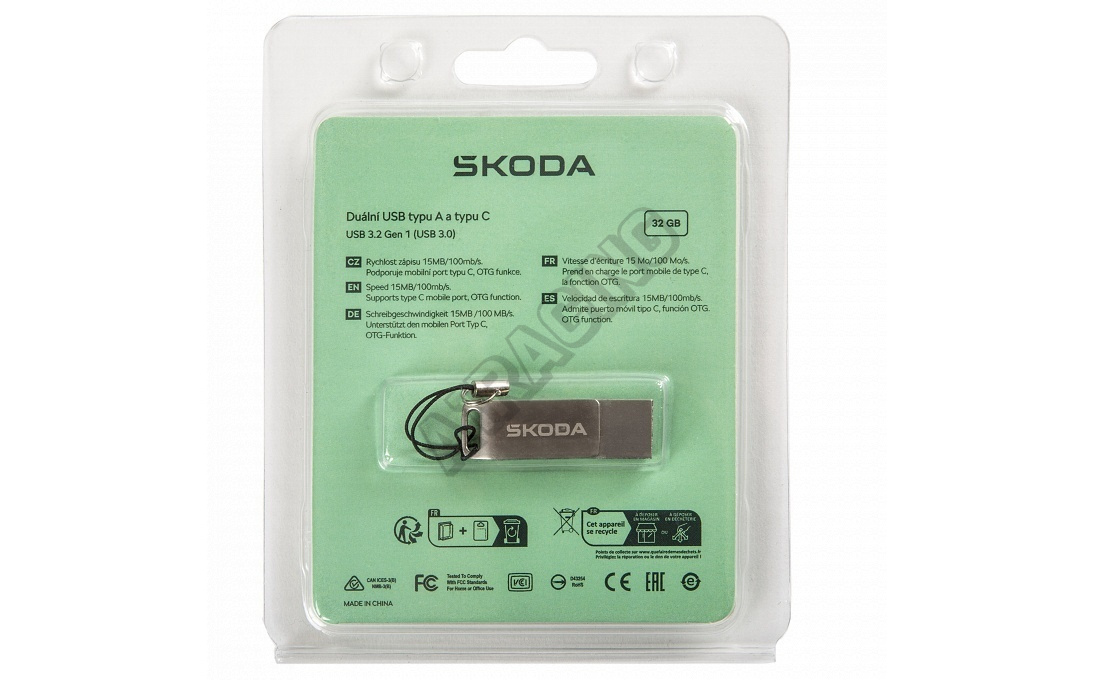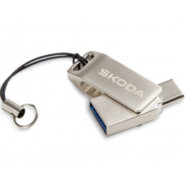 Duální USB s konektorem USB-C a USB-A o kapacitě 32 GB s novým logem Škoda. Rozhraní USB 3.2 Gen 1 (USB 3.0), rychlost zápisu dat 15MB/100mb/s. Podporuje mobilní port typu C, který má funkci OTG pro ukládání a kopírování dat.