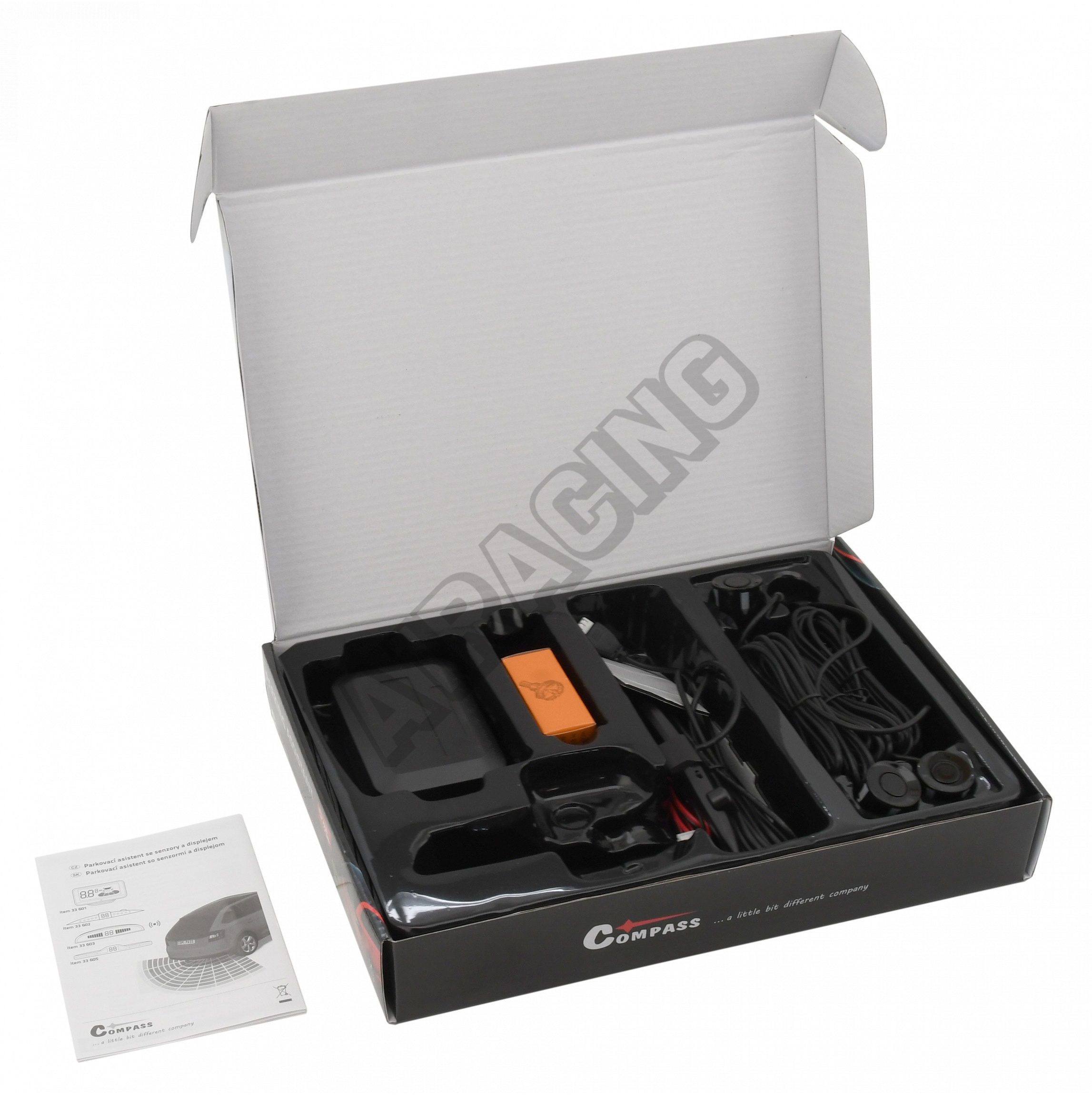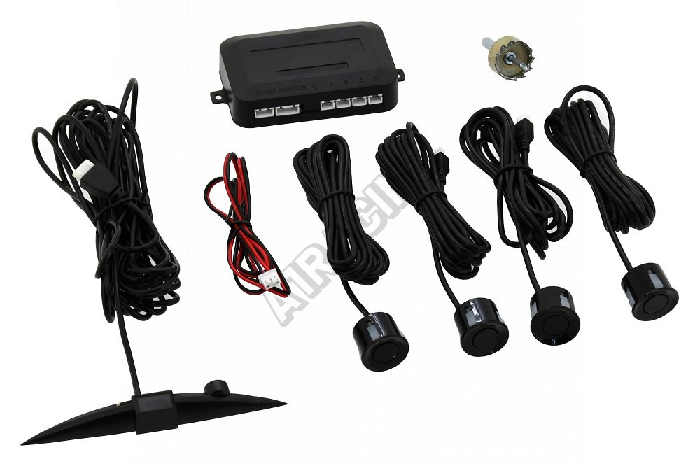Balení obsahuje displej, řídící jednotku, 4 senzory pro montáž do zadního nárazníku, odpovídající kabeláž a vrták odpovídajícího průměru.