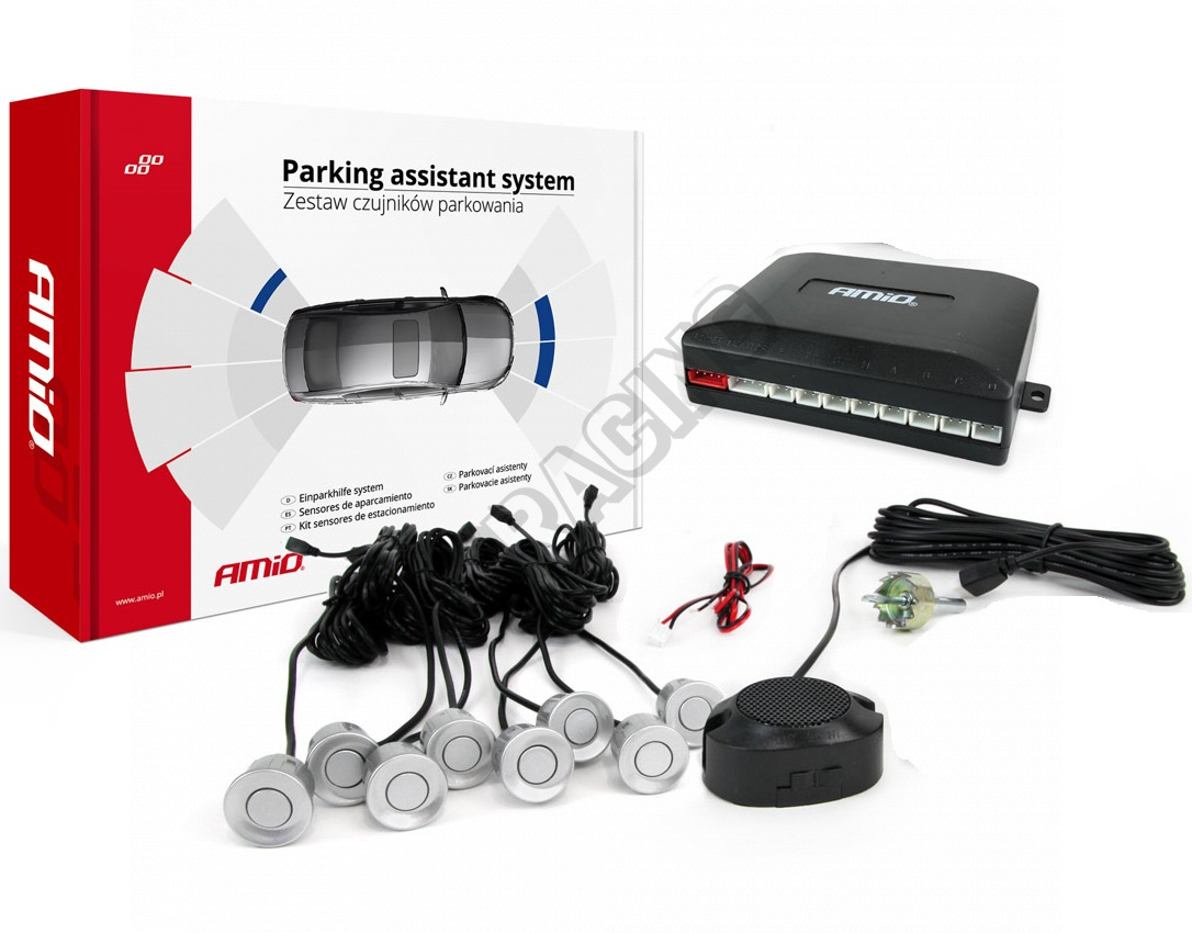 Parkovací systém s akustickou signalizací 8 stříbrných senzorů (předek + zadek)