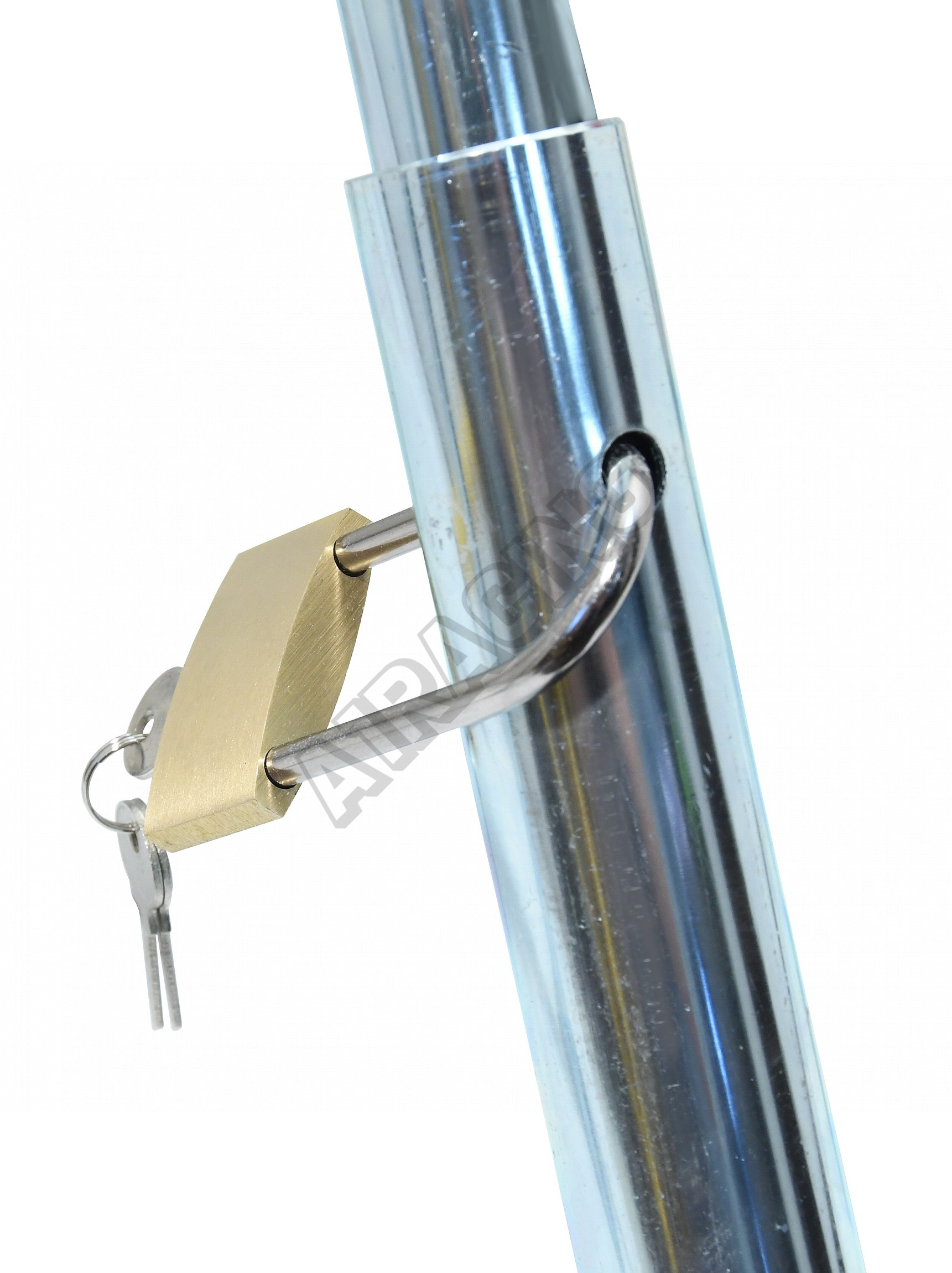 Zábrana je tvořena robustní konstrukcí s povrchovou úpravou vhodnou do venkovních prostor. Zamykání je řešeno visacím zámkem umístěným na šikmé, teleskopické části konstrukce, tak aby po odemčení bylo možné zábranu jednoduše a rychle složit.