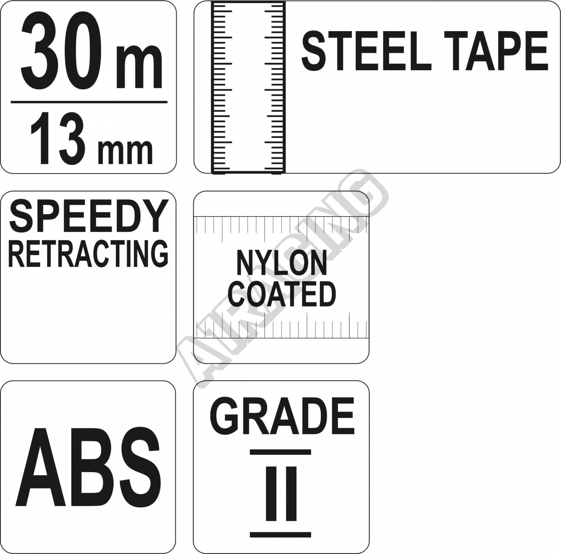 Měřící pásmo o délce 30 m s šířkou 13 mm. Určené pro měření velkých vzdáleností v otevřené oblasti,