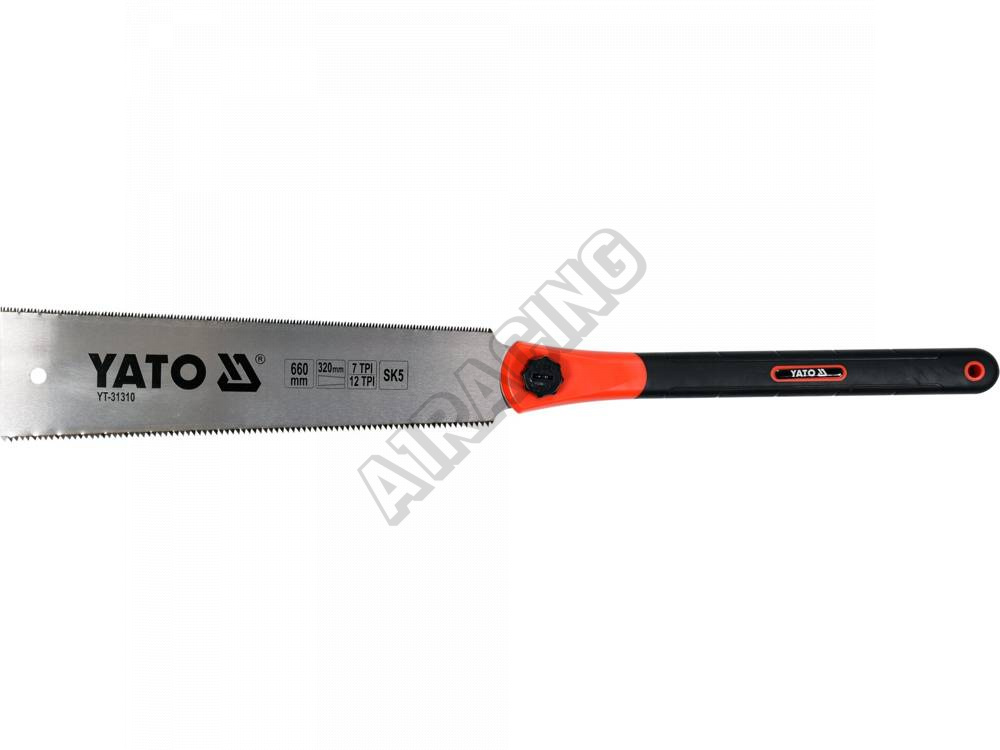 Japonská oboustranná ruční pila (tzv. ryoba). Kalené zuby na obou hranách čepele. Rozteč 7 tpi na jedné straně a 12 tpi na druhé straně výrazně zvyšuje využitelnost pily.