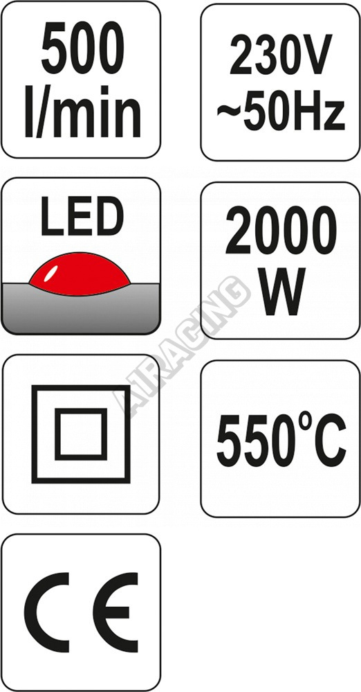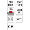 Klasická kvalitní horkovzdušná pistole Yato s třemi stupni výkonu, přičemž stupeň II a III má plynulou regulaci teploty. Teplota je signalizována stupnicí tvořenou 5 LED diodami. Pistole je vybavena čtyřmi usměrňovacími tryskami a škrabkou pro opalování starých nátěrů.