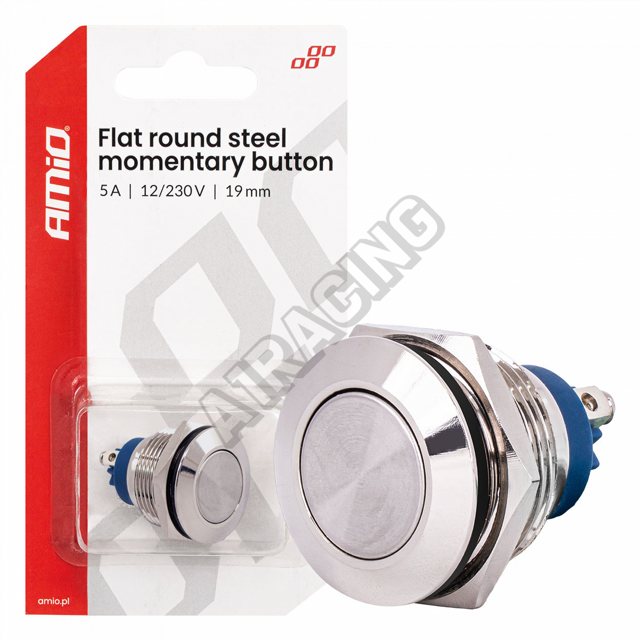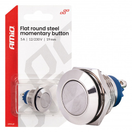 Profesionální ploché momentové tlačítko o průměru 19 mm, vyrobené z oceli, určené pro ovládání elektrických obvodů 12/230 V. Umožňuje dočasné uzavření nebo otevření obvodu při proudu do 5 A, což z něj činí ideální volbu pro použití ve vozidlech, průmyslových zařízeních a ovládacích panelech.