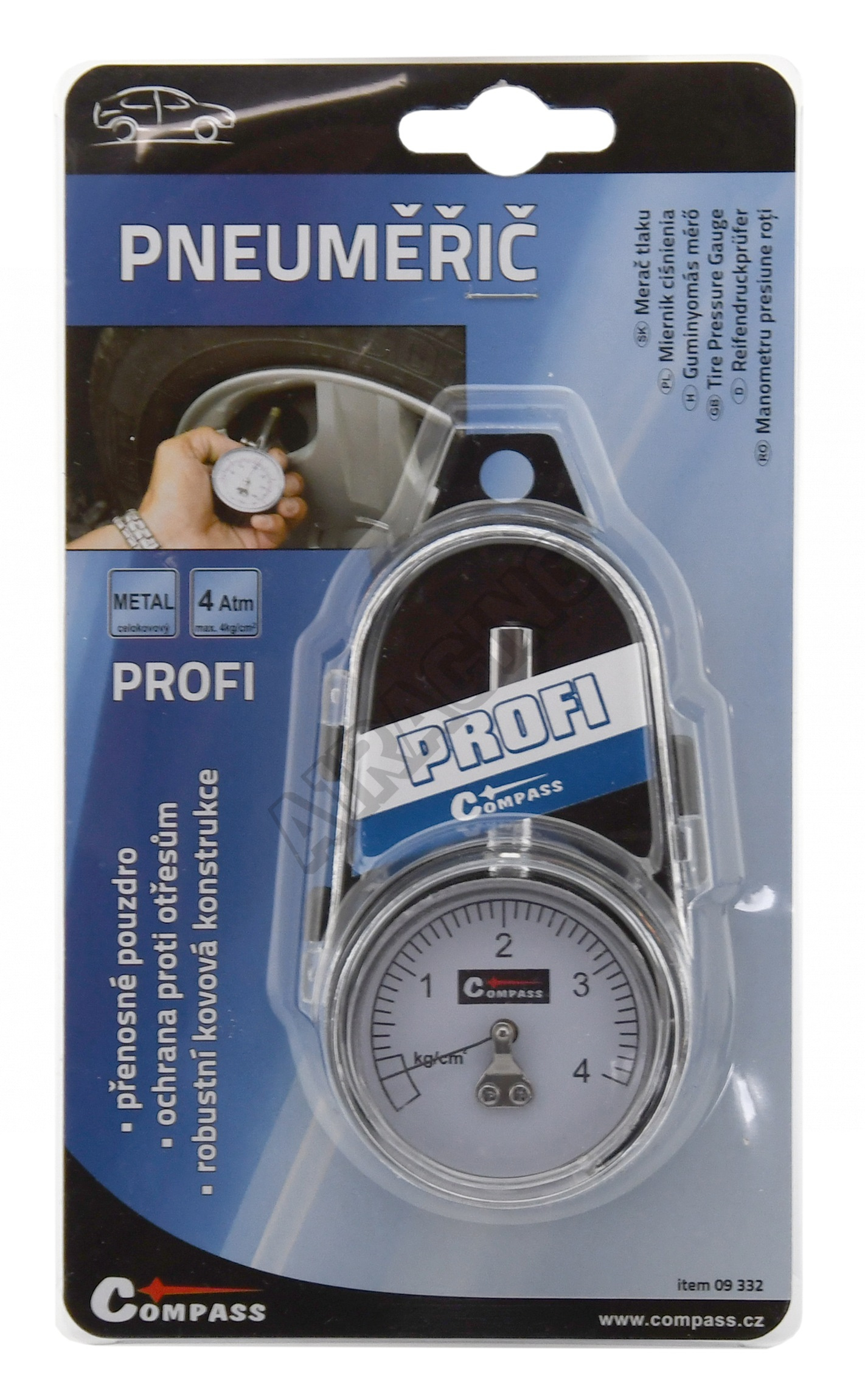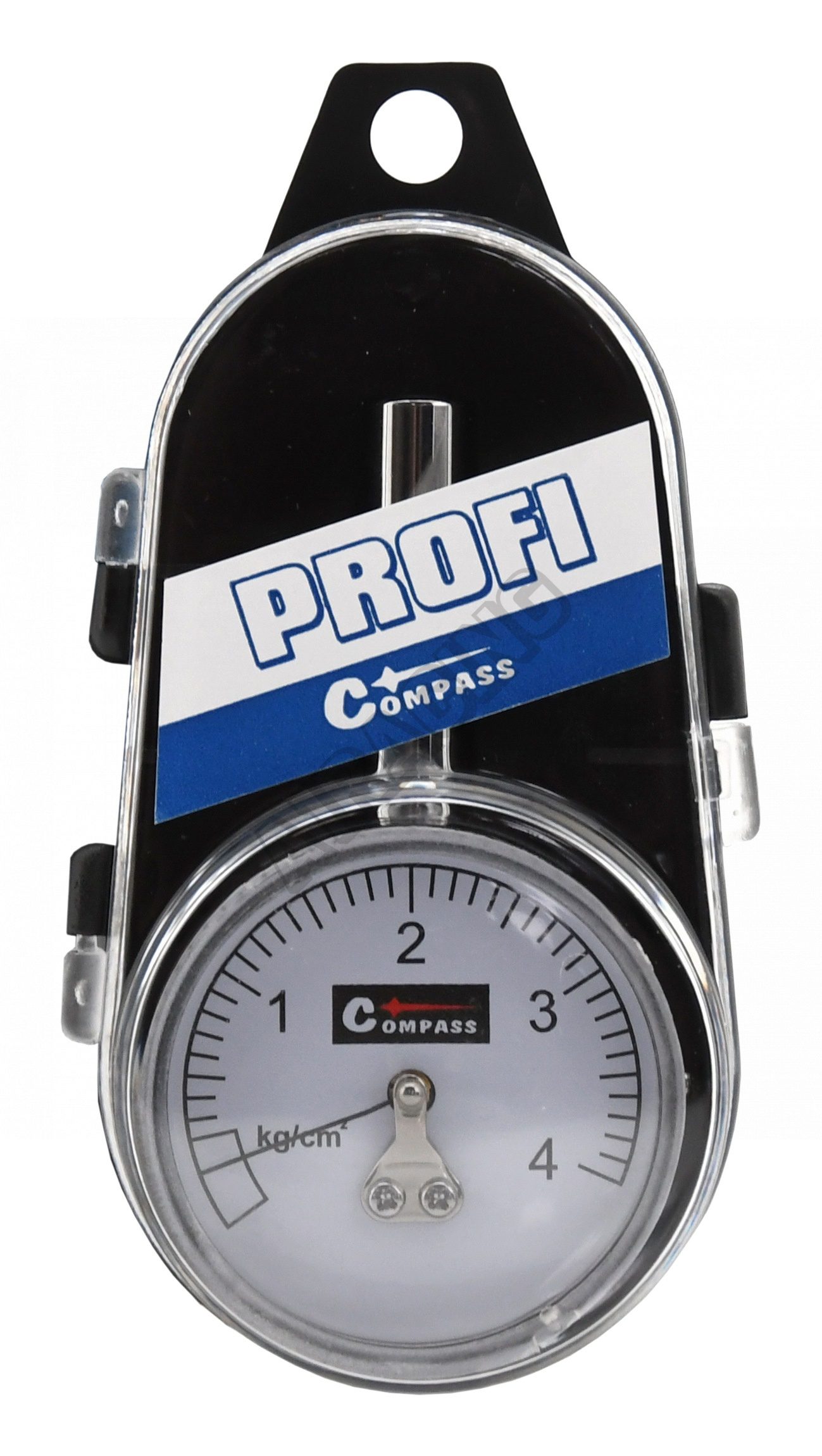 Profesionální celokovový měřič tlaku v pneumatikách. Uzavíratelné plastové pouzdro ochrání pneuměřič proti poškození. Rozsah až 0,3 - 4 Atm.