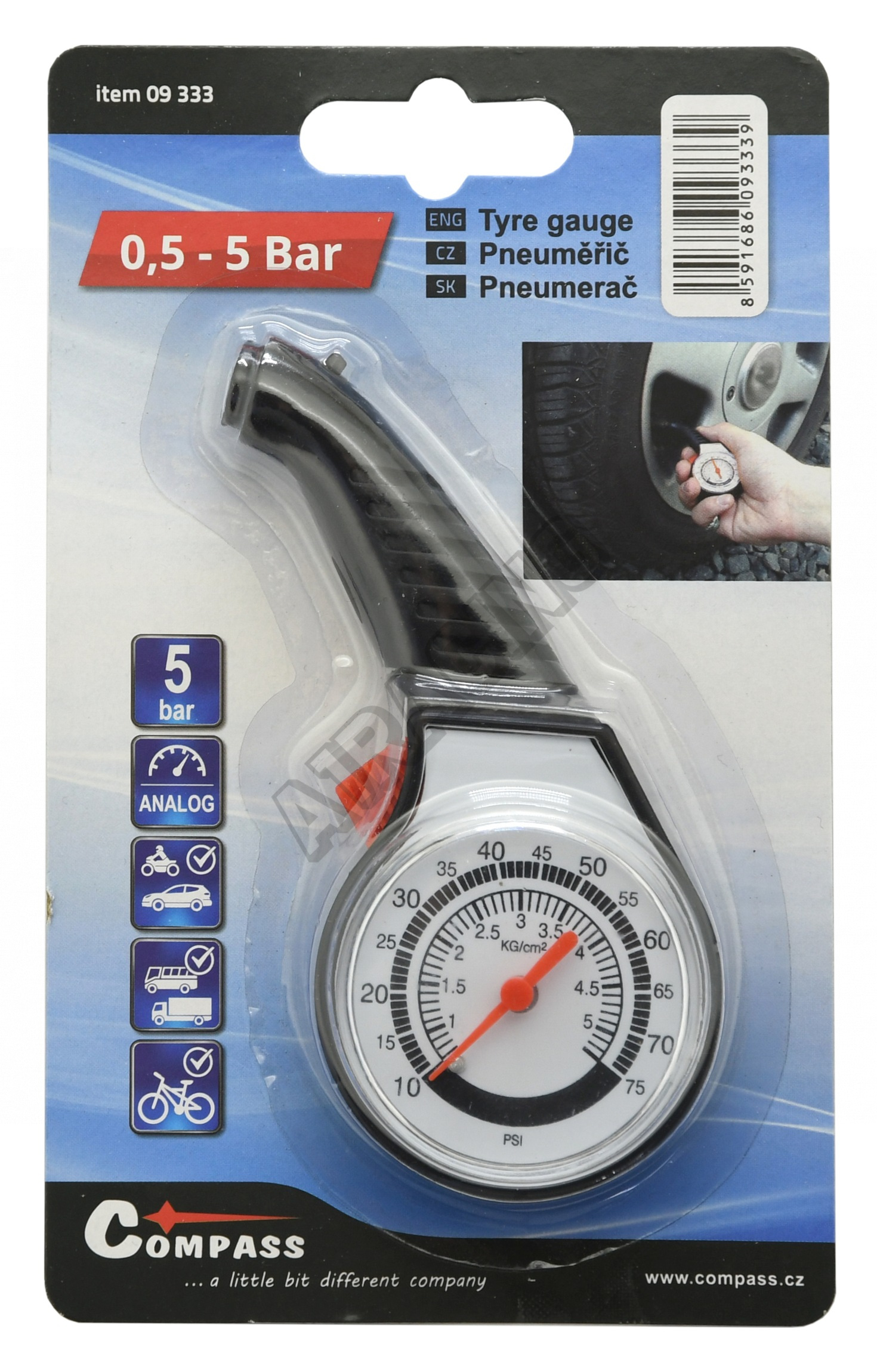 Pneuměřič 0,5 - 5 bar Měřič tlaku v pneumatikách, rozsah až 0,5 - 5 Bar.
