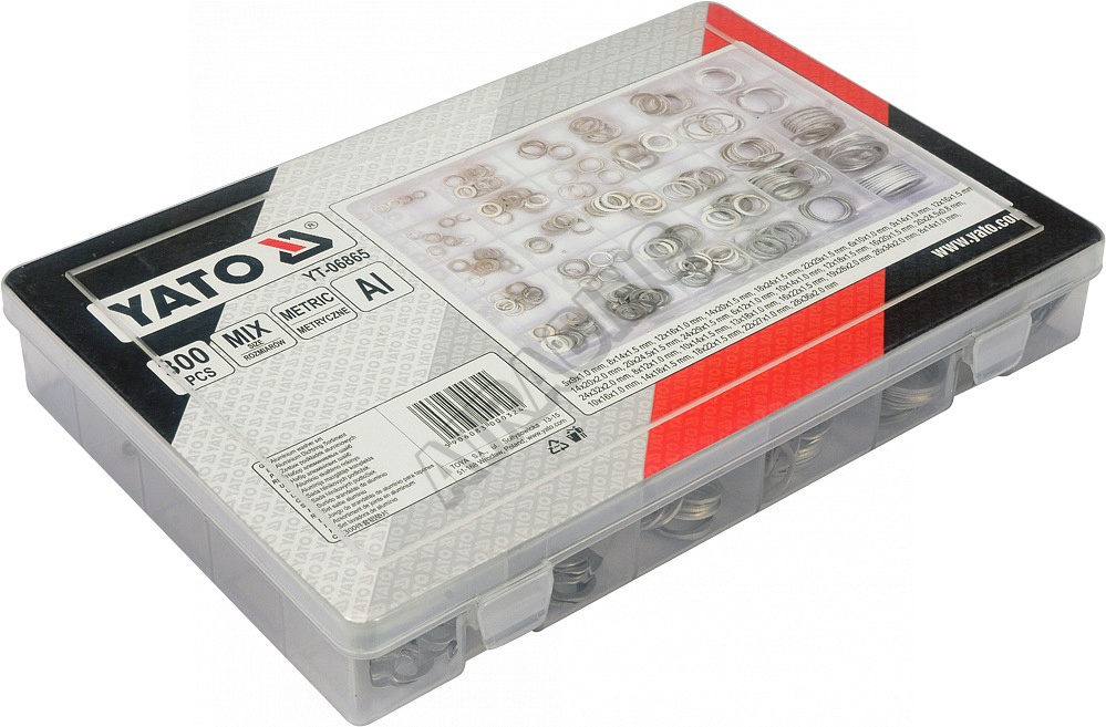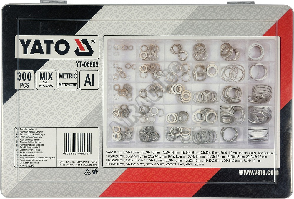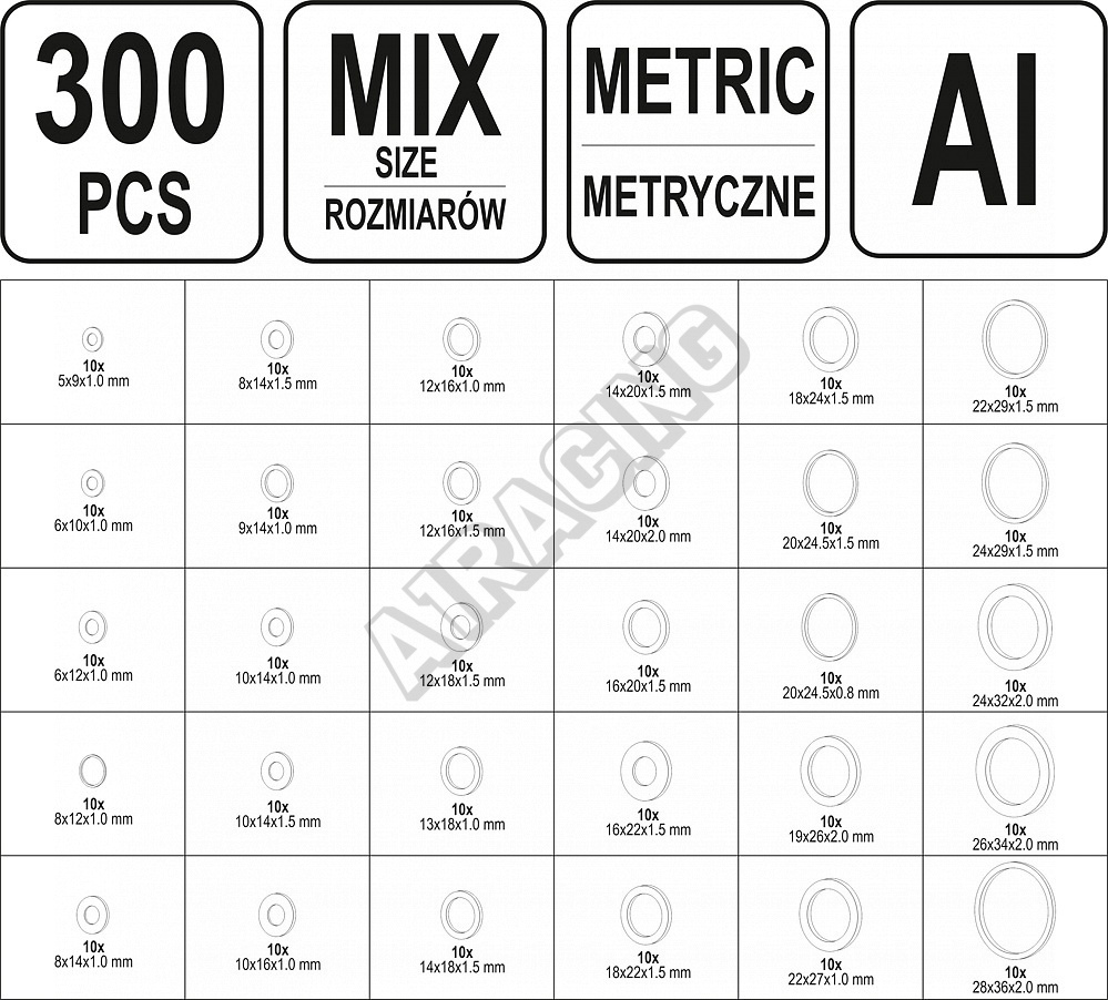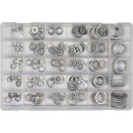 Sada 300 ks kvalitních hliníkových podložek rozměrů od 5 x 9 mm do 28 x 36 mm, dohromady 30 druhů podložek po 10 ks.
