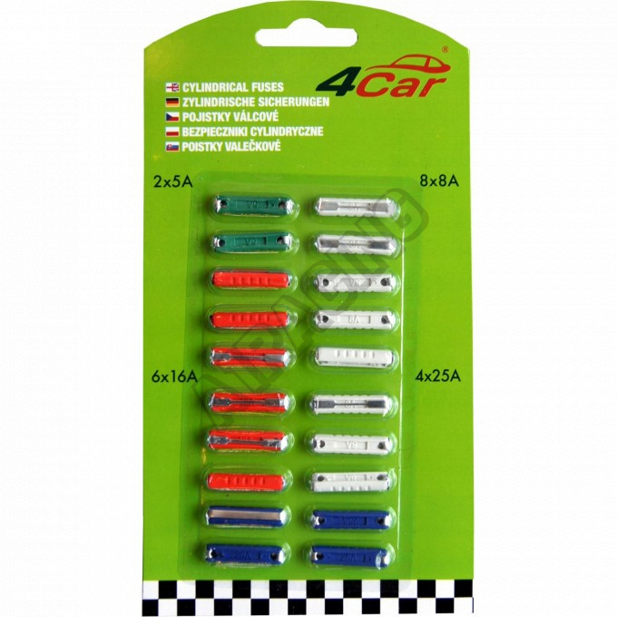 Pojistky válečkové: Komplet / 20 ks / válečkových pojistek. 2x5AMP, 8x8AMP, 6x16AMP, 4x25AMP.