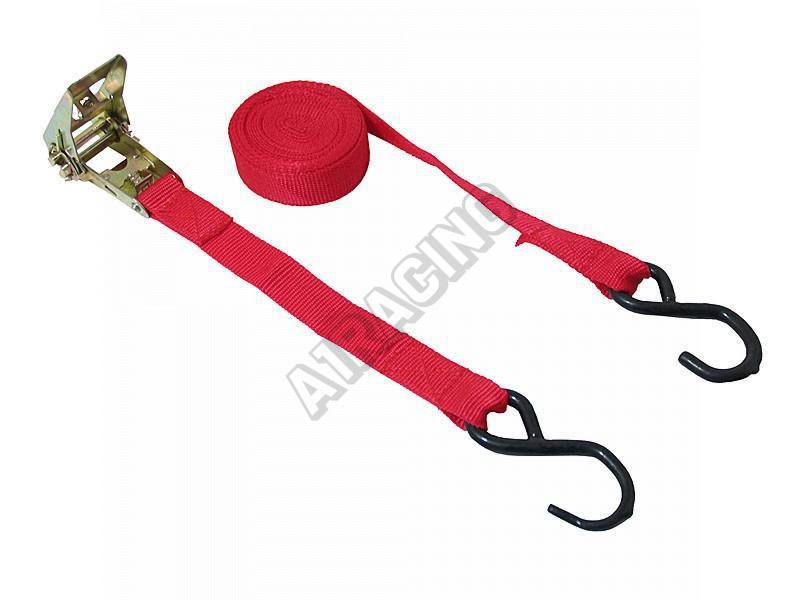 Upínací popruh s kovovou ráčnou a dvěmi kovovými háky, délka 5 m, šířka 25 mm.