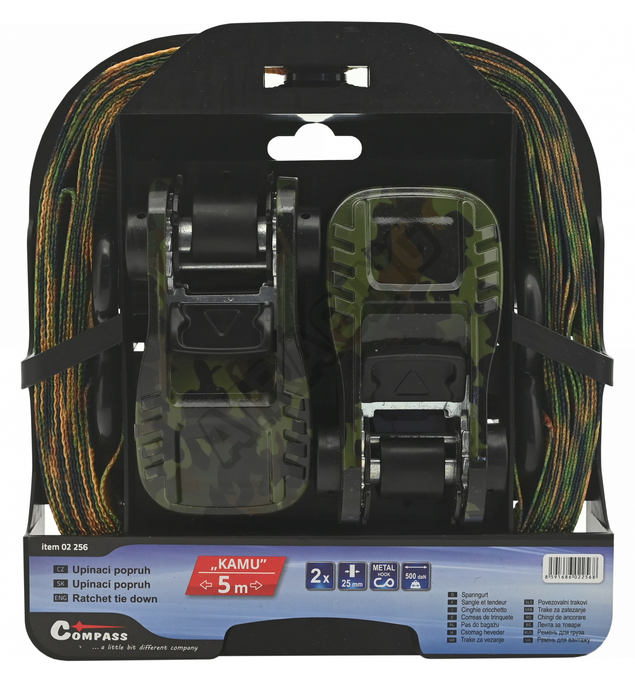 Popruhy s kamufláží mají šíři 25 mm, délku 5 m a vyznačují se tažnou silou 500daN.