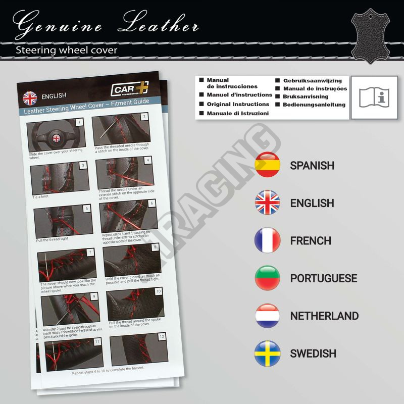 Kvalitní značkový kožený potah volantu. Balení obsahuje potah, režnou nit s jehlou pro utažení po nasazení na volant. Kvalitou se vyrovná originálnímu potahu na volantu. Potah si drží stálou strukturu, nenatahuje se, neklouže, nepotí se ruce a rozhodně samotný volant vypadá lépe než běžné provedení - je navíc efektně děrovaný . Aplikace je velice jednoduchá, kde potah se nasadí, kde krajní strany se utahují pomocí režné nitě, která se propletá švy naproti sobě viz obrazkový postup přímo na potahu.